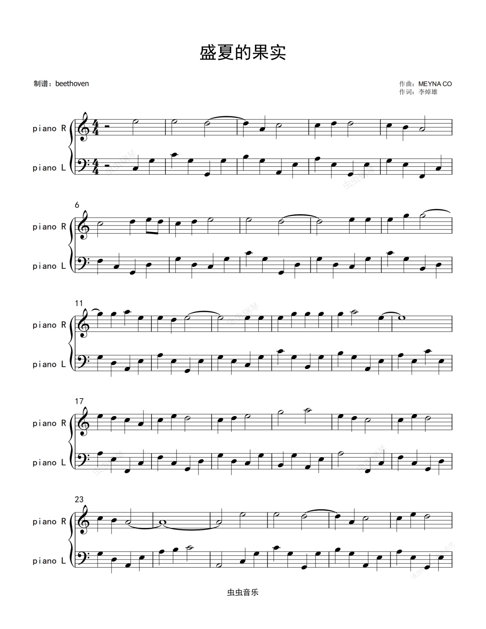 钢琴谱:盛夏的果实(超级好听) 莫文蔚