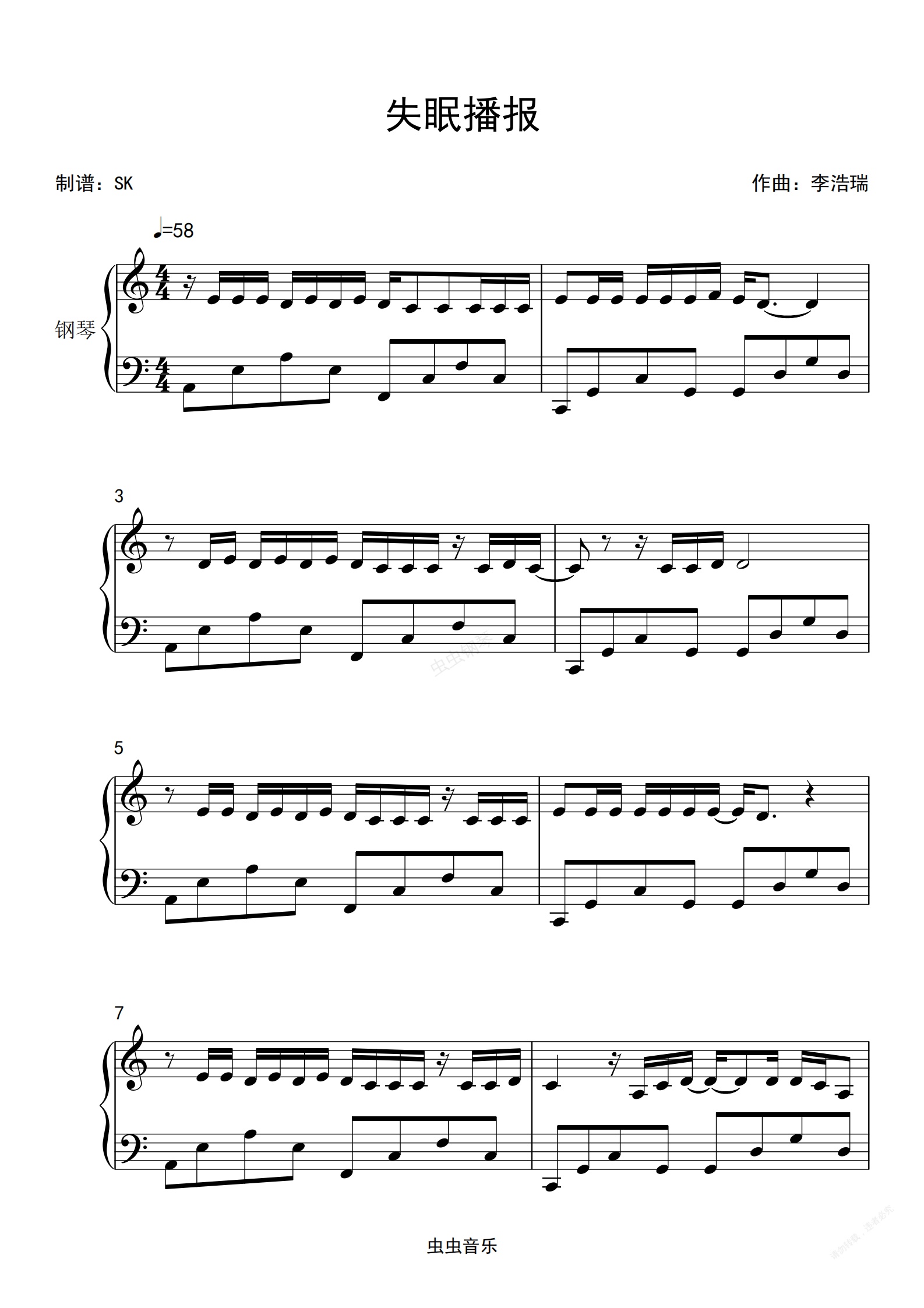 钢琴谱:林晨阳《失眠播报》C调简单版