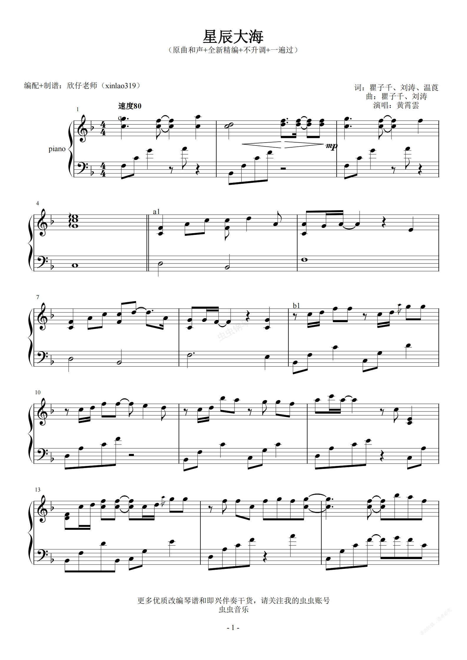 钢琴谱:黄霄雲-F调-星辰大海(原曲和弦+全新精编+不升调+一遍过)