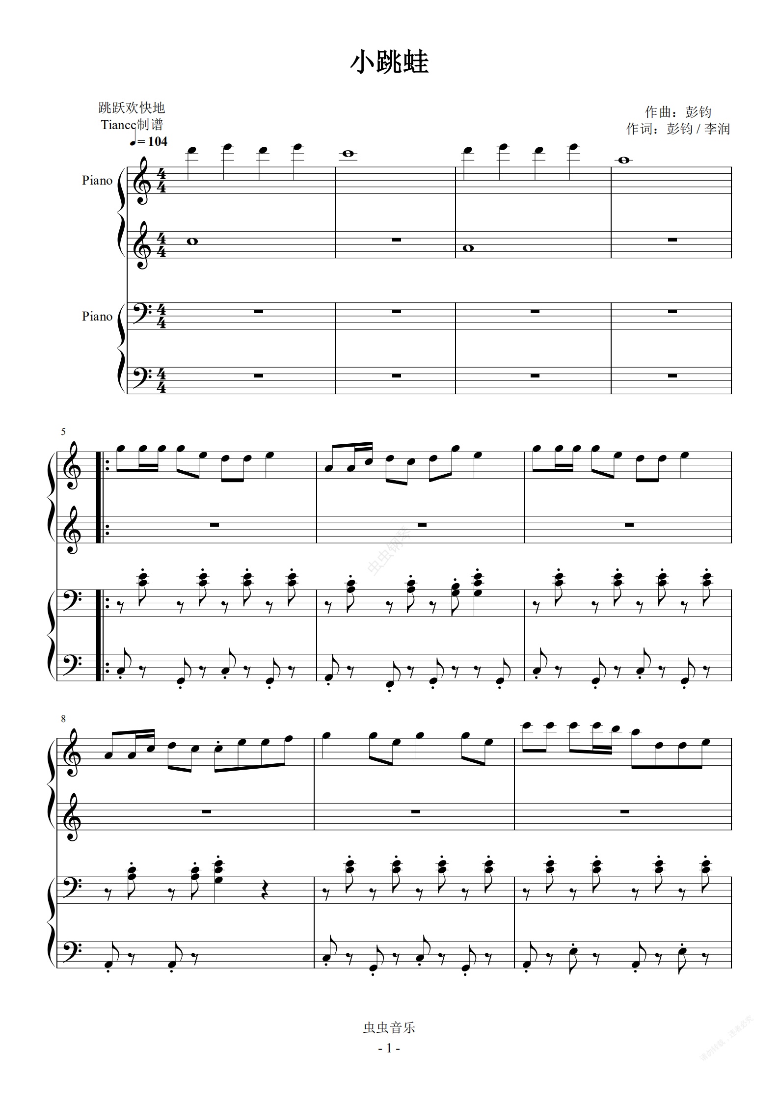 钢琴谱:《小跳蛙》四手联弹谱,拜厄+难度,好听好弹还能唱