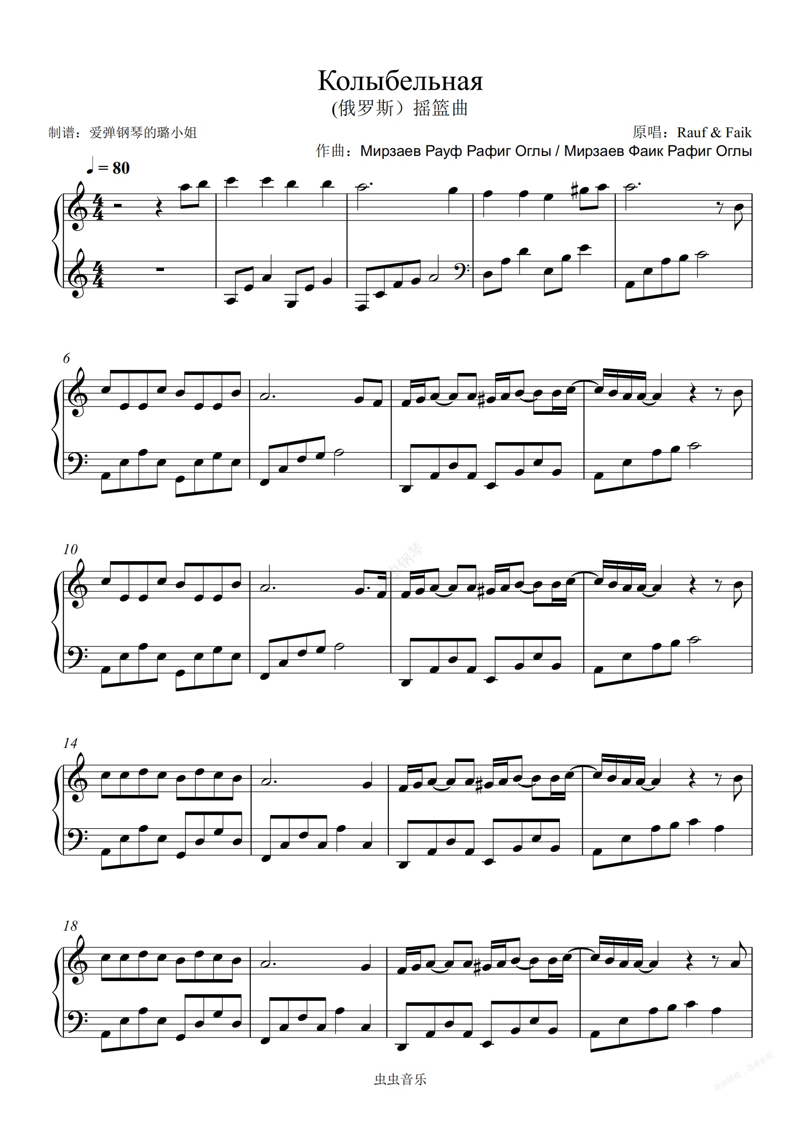 钢琴谱:Колыбельная(俄罗斯摇篮曲)C调简单版