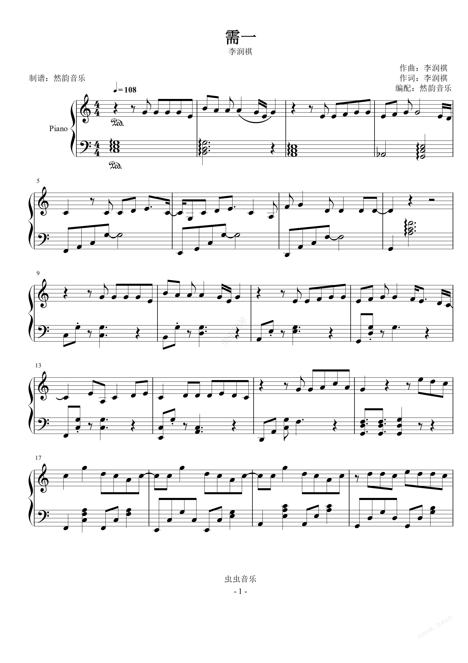 钢琴谱:需一-李润祺 钢琴完美独奏