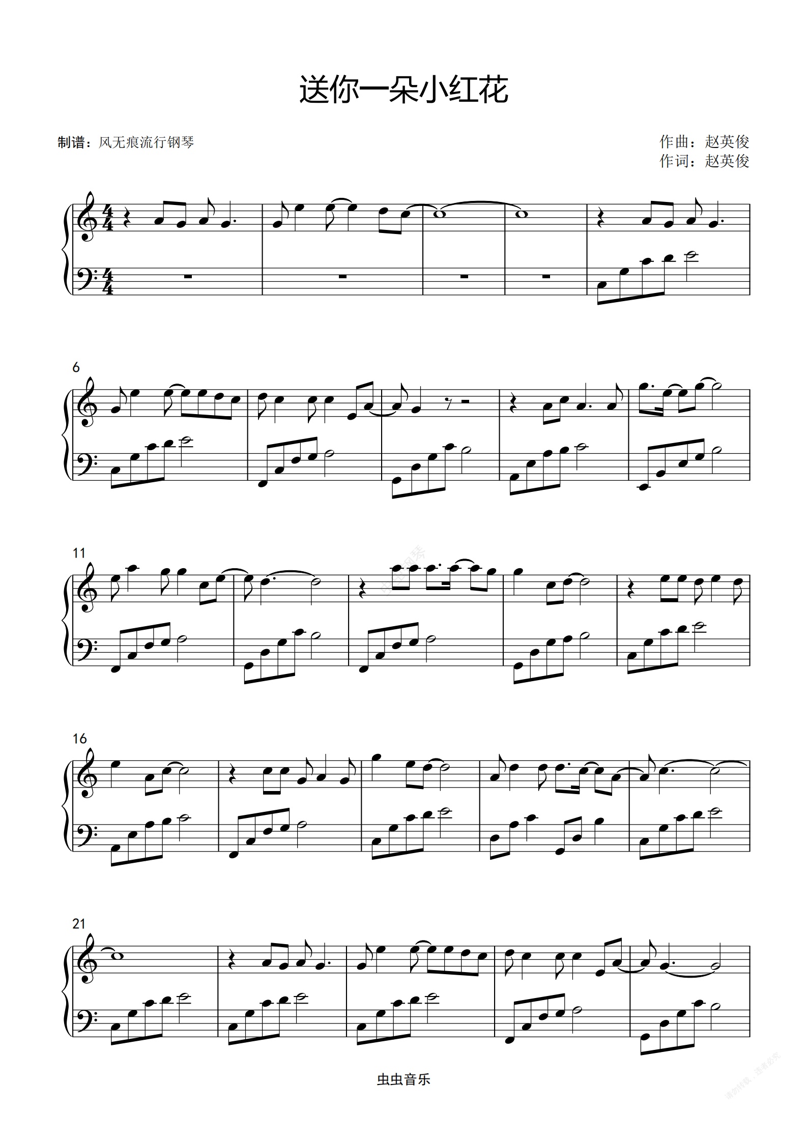 钢琴谱:送你一朵小红花(无转调)-赵英俊〖简易动听〗