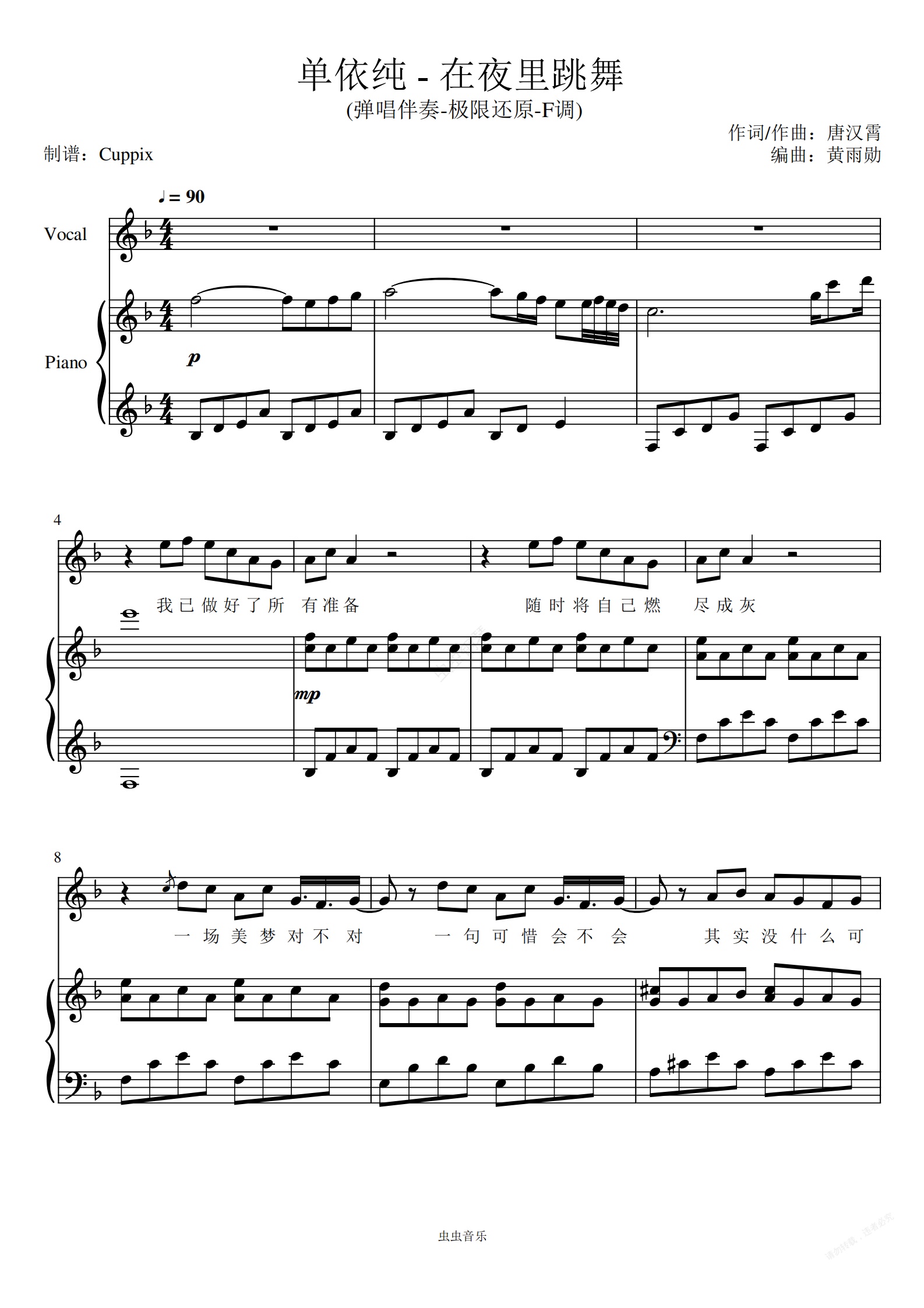 钢琴谱:《在夜里跳舞》弹唱伴奏附词-F调版-极限还原(单依纯)