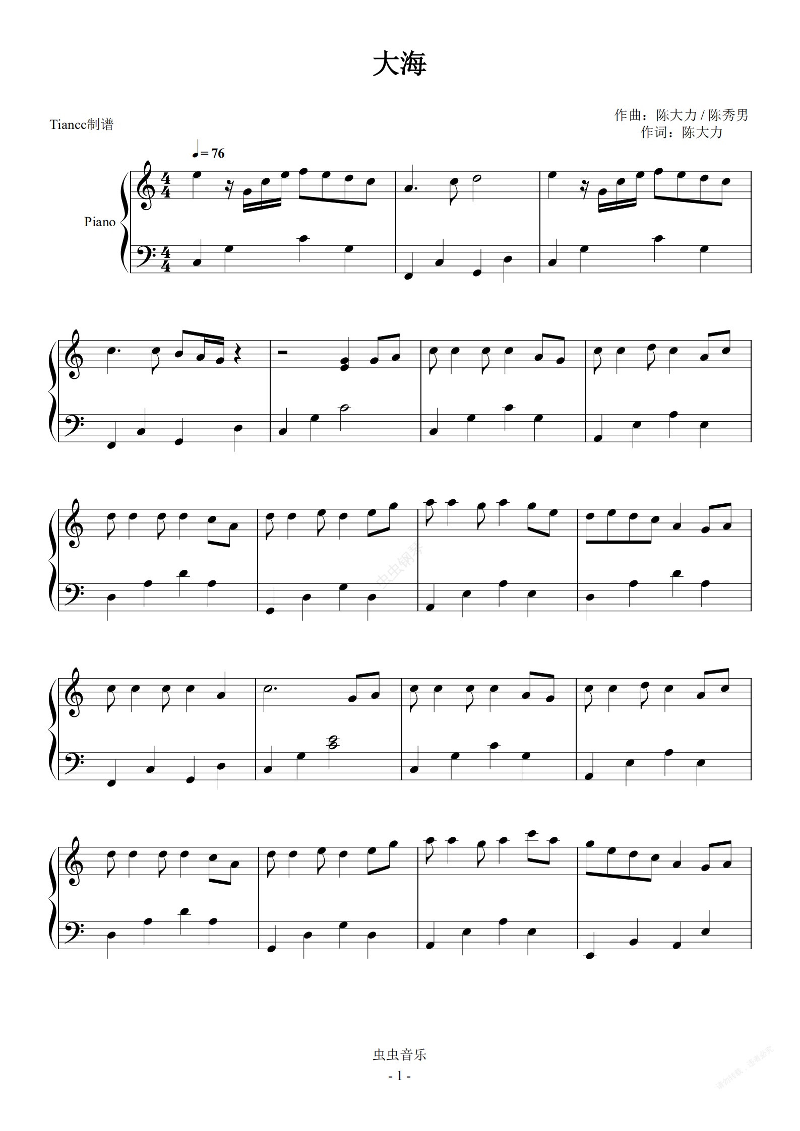 钢琴谱:《大海》张雨生,C调拜厄难度,好弹又好听