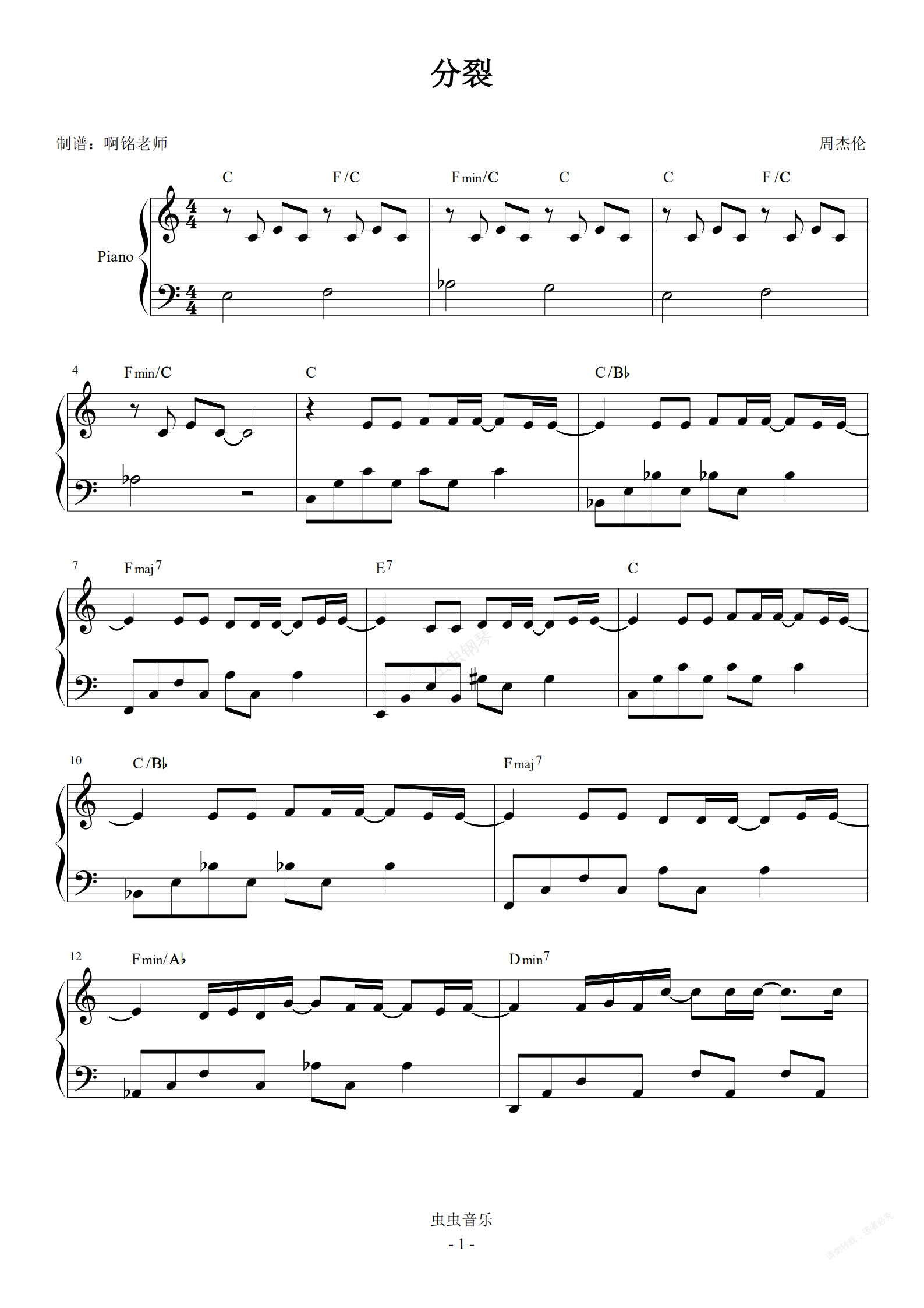 钢琴谱:分裂 C调简易