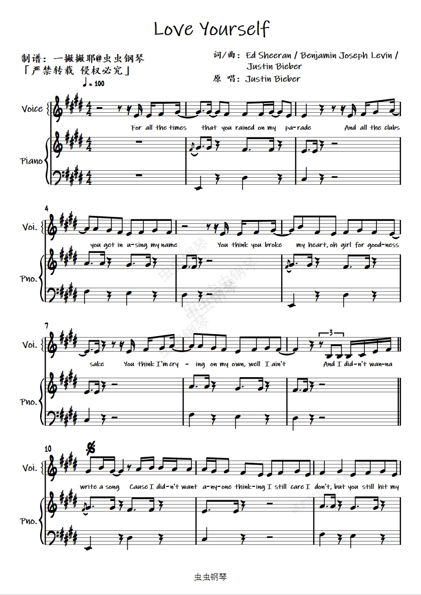钢琴谱:Love Yourself【弹唱(附和声)谱】Justin Bieber「一撇撇耶」