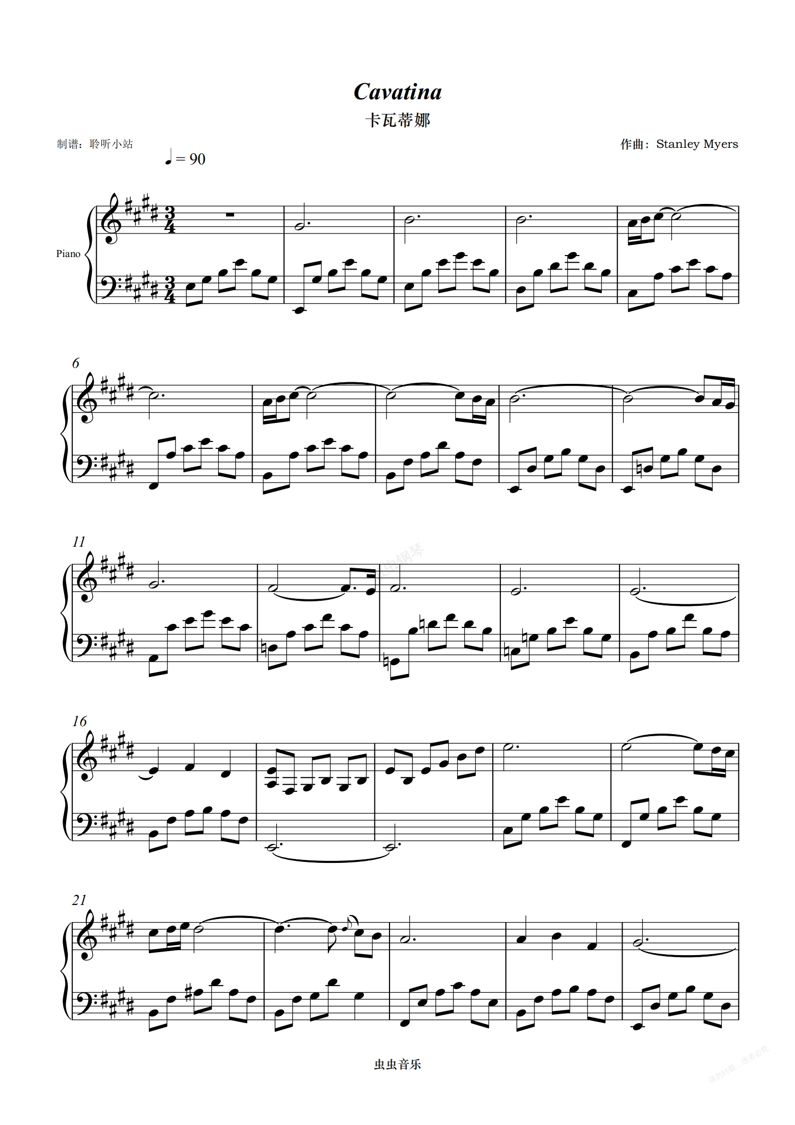 卡瓦蒂娜()是一个音乐术语,意思是短曲或短抒情调。这一首《卡瓦蒂娜》是英国作曲家斯坦利·迈尔斯( Myers)于 1970 年为电影《手杖 (The Stick)》编写的古典吉他作品,并在大约八年后作为另一部电影《猎鹿人》的主题曲而流行。1973 年,这首曲子也曾经被克莱奥·莱恩(Cleo Laine)填词为《He Was》,由古典吉他手约翰·威廉姆斯(John)演奏。此钢琴版本根据中国录音录像出版总社 1994 年出版的《世界名曲:浪漫吉它经典》(CD)中的吉他演奏版本改编而来。