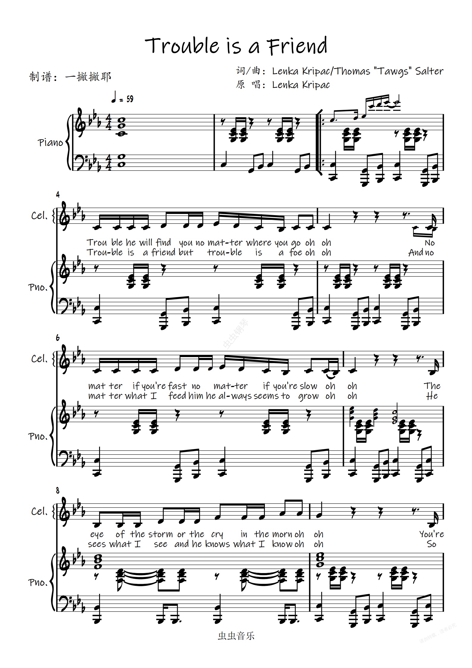 钢琴谱:【弹唱(附和声)谱】Trouble is a Friend-Lenka「一撇撇耶」