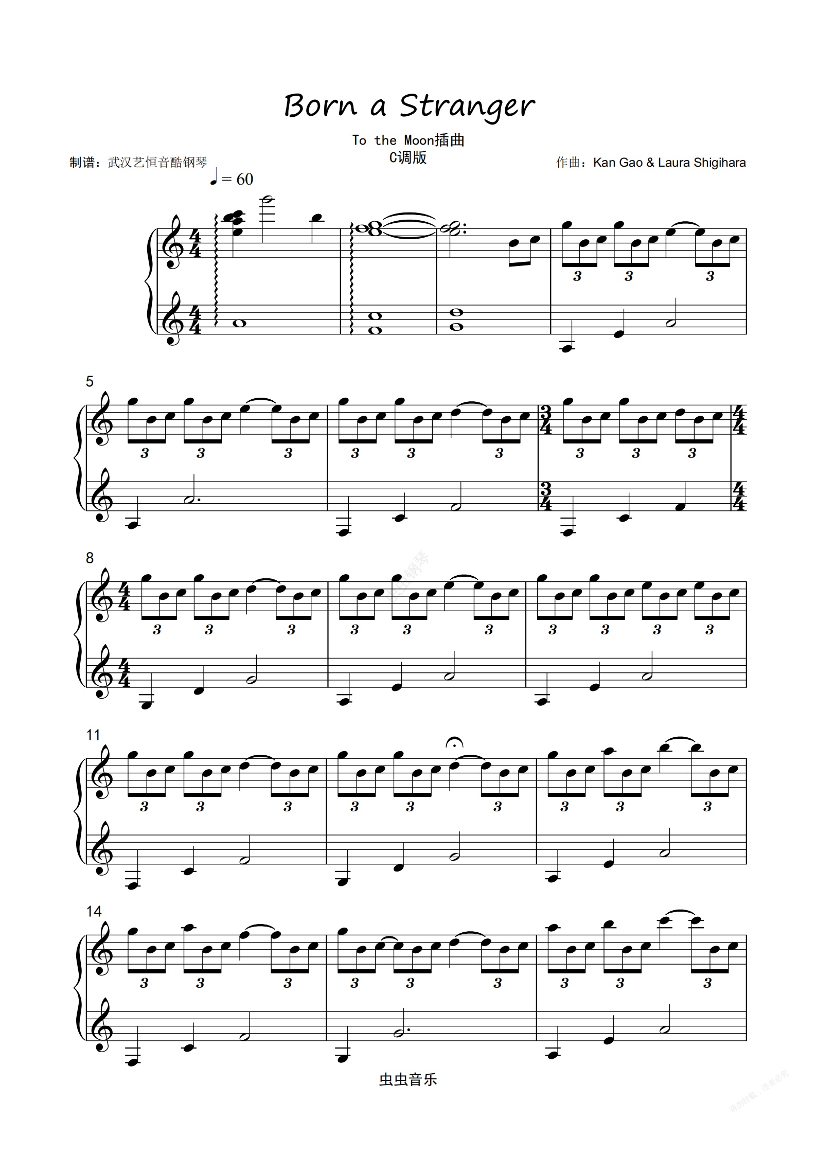 钢琴谱:《Born a Stranger》C调版(To the moon插曲)