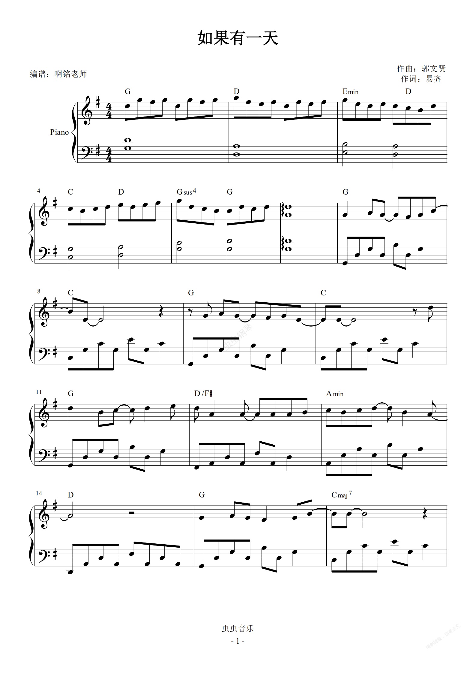 钢琴谱:如果有一天 G调简易 原版和弦