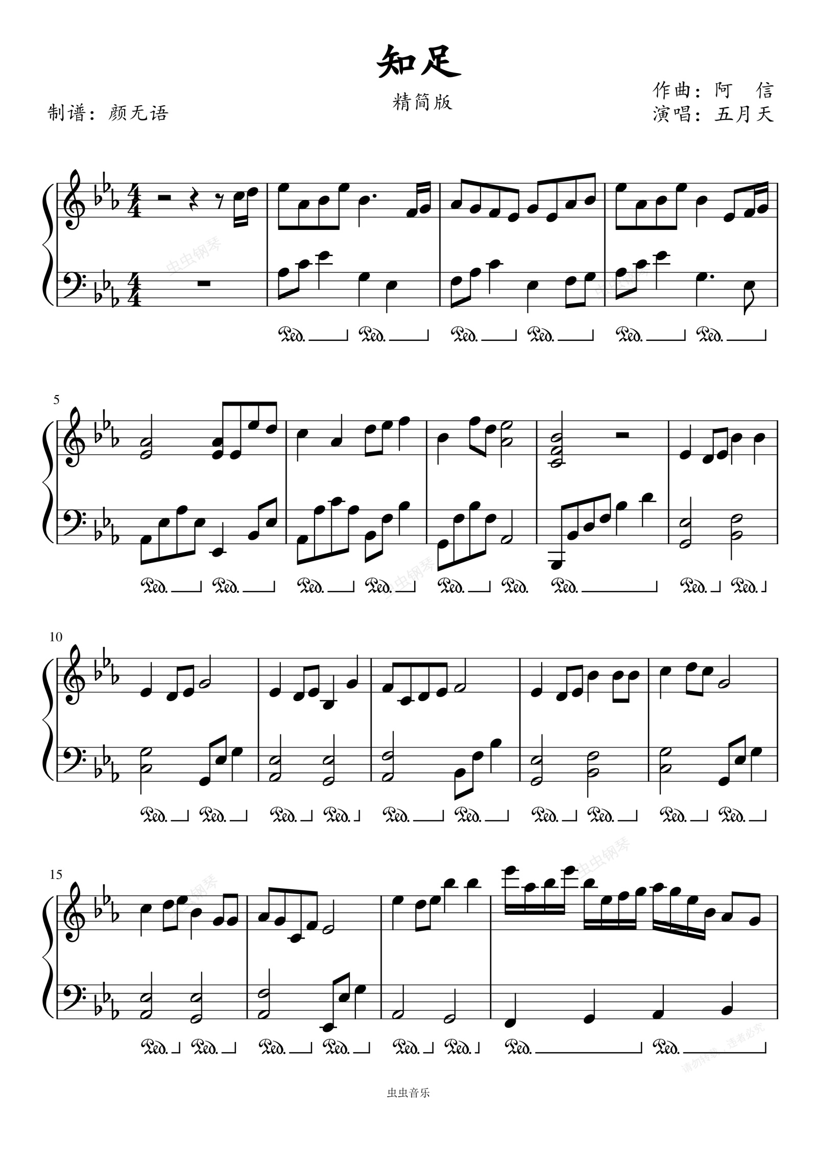 钢琴谱:知足 五月天 精简动听降E