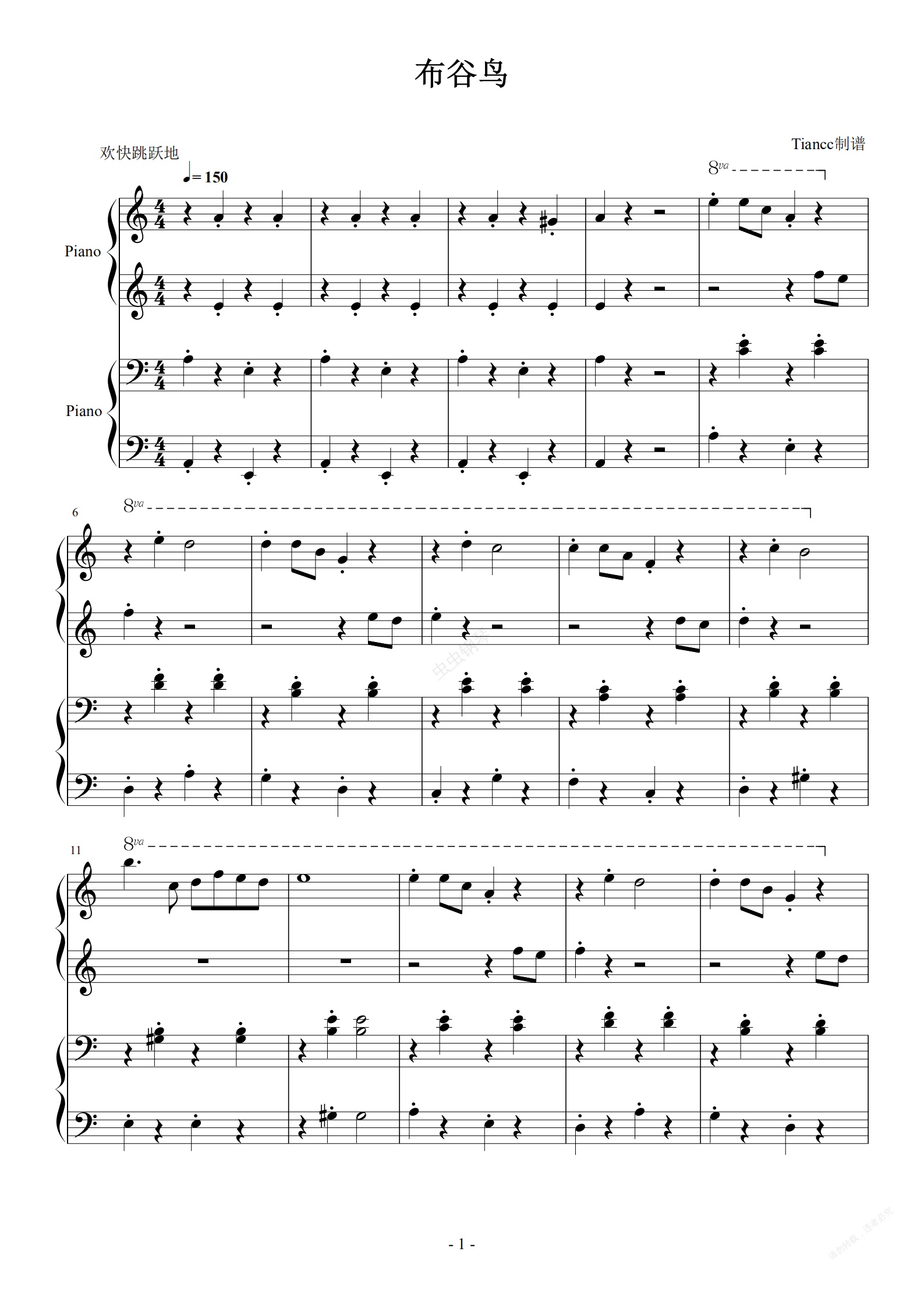 钢琴谱:《布谷鸟》安子与九妹,四手联弹,小汤3+拜厄难度