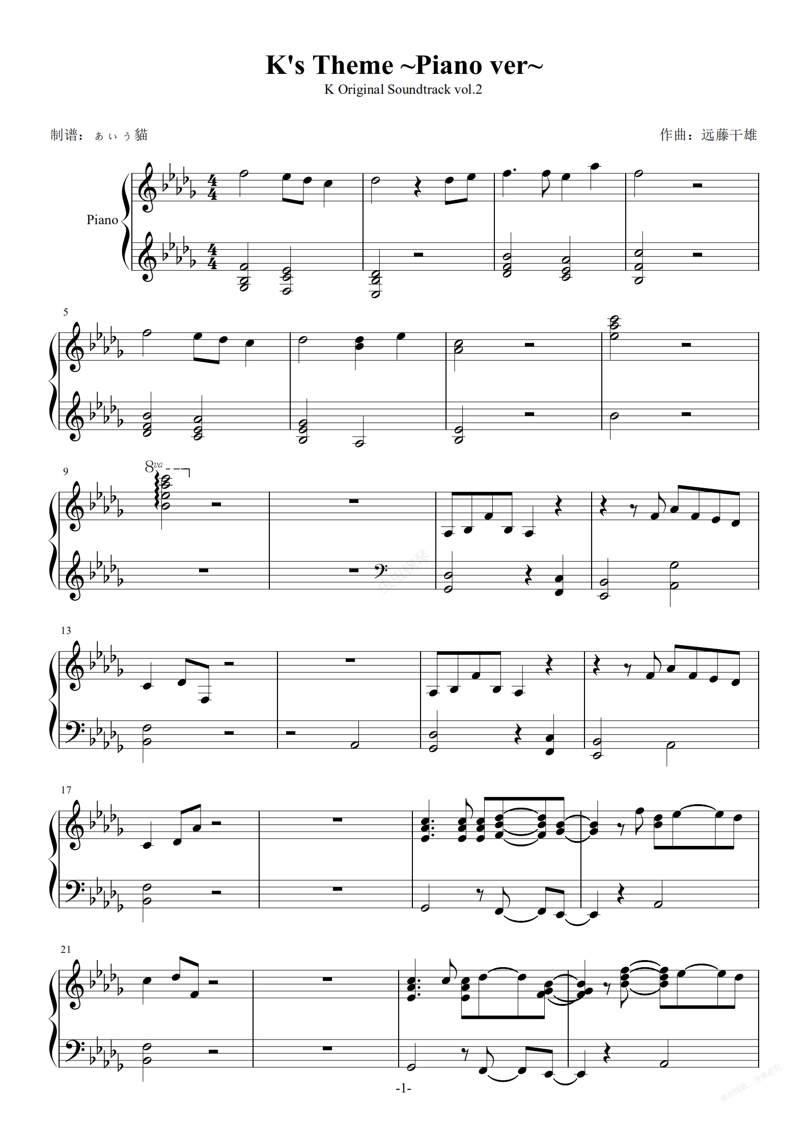钢琴谱:【K】插曲-K's Theme ~Piano ver~