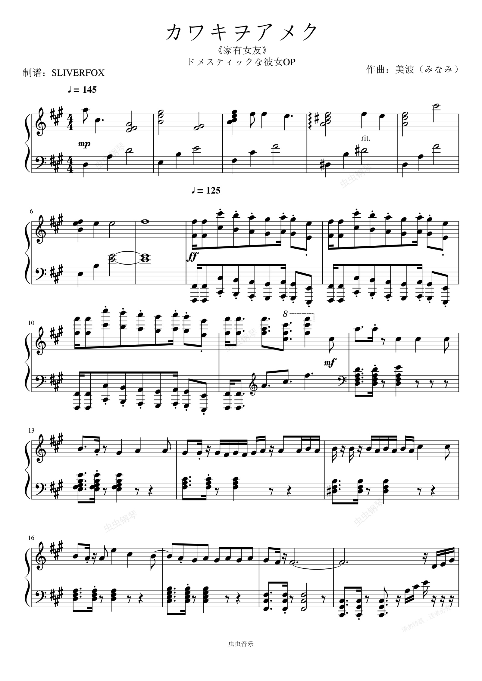 钢琴谱:《カワキヲアメク》动漫家有女友片头曲 高能简易