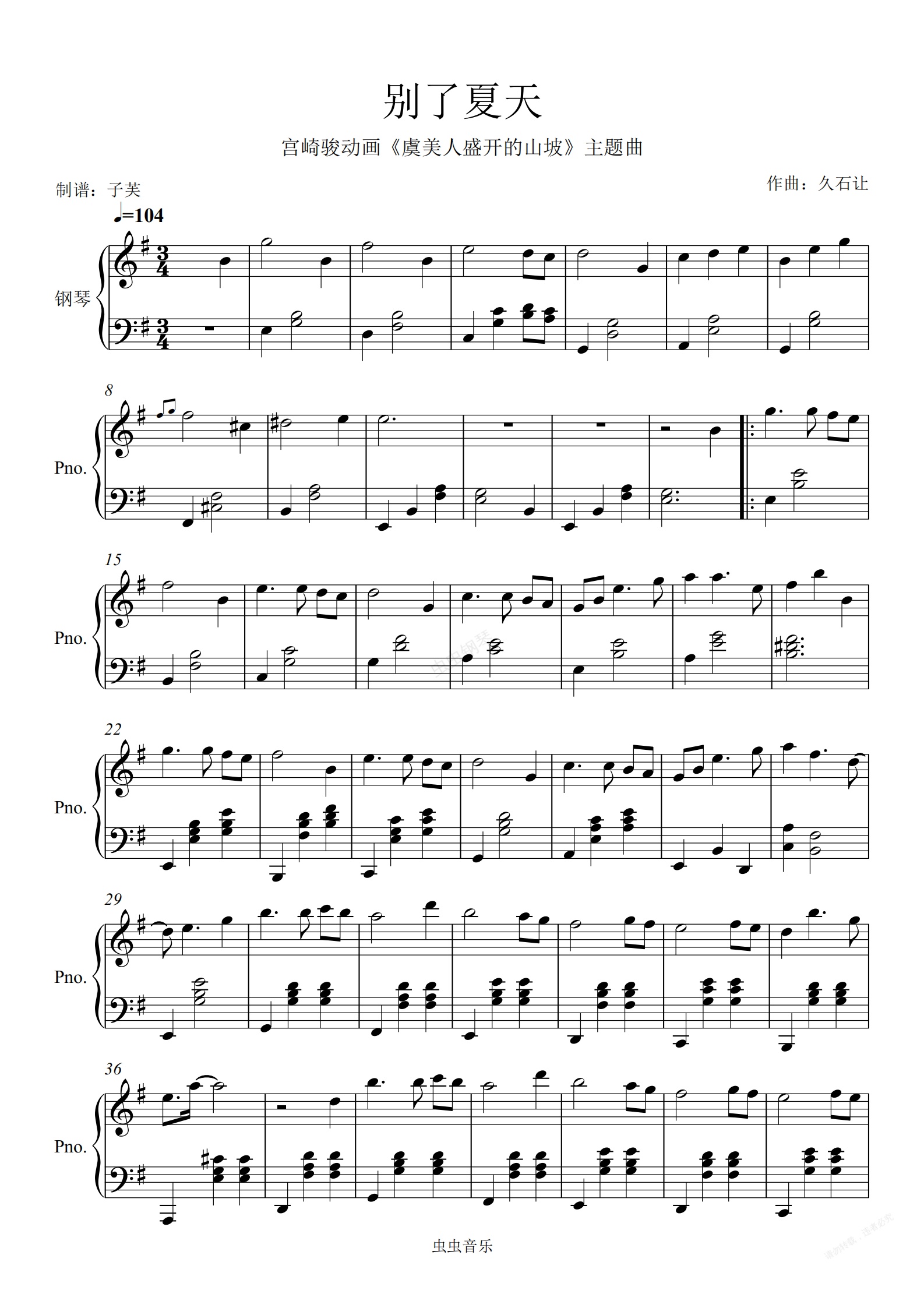 钢琴谱:《别了夏天》宫崎骏动画-经典简易版