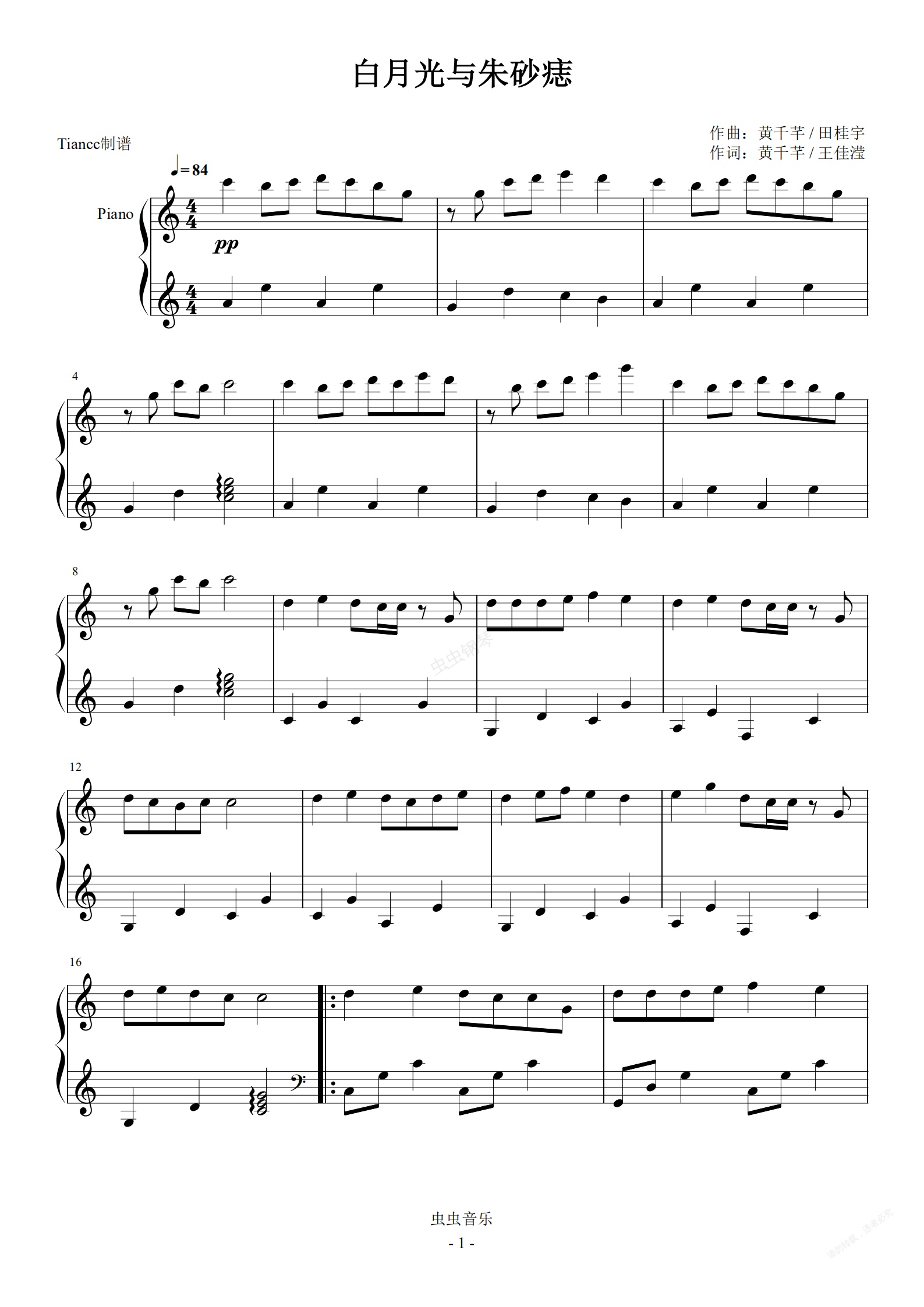 钢琴谱:《白月光与朱砂痣》C调拜厄难度,新手福音~