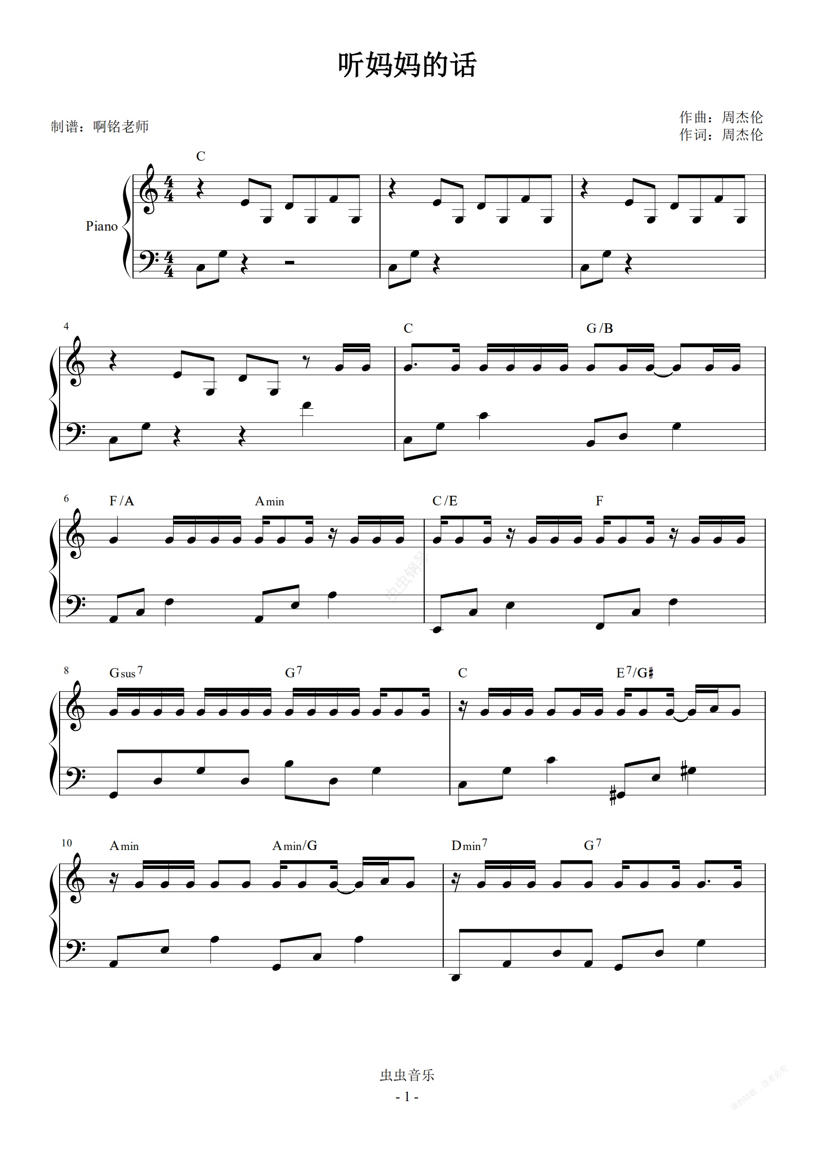 钢琴谱:听妈妈的话 C调简易 原版和弦