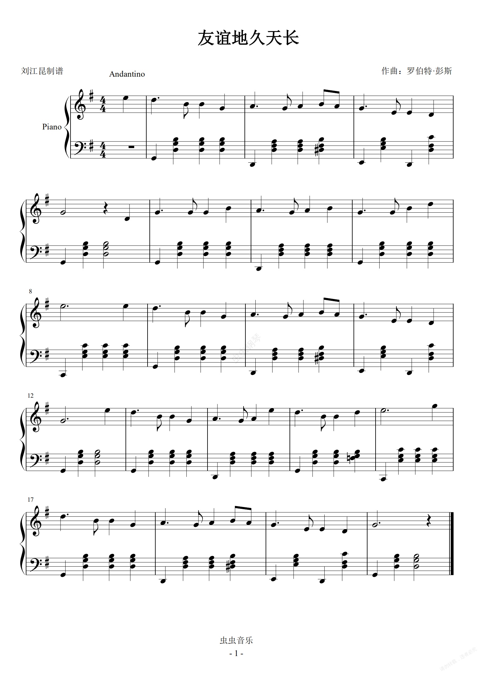 钢琴谱:友谊地久天长(G大调版本)
