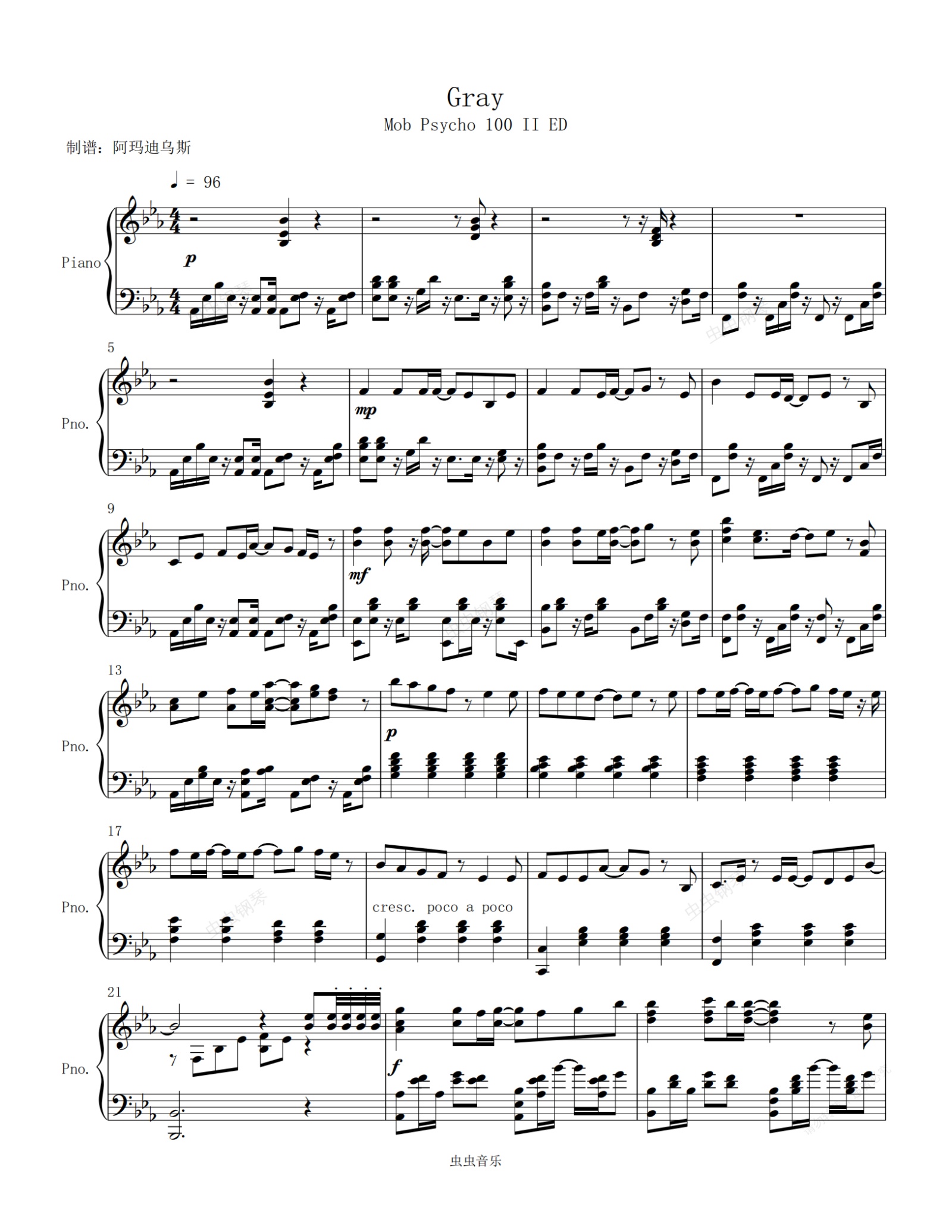 钢琴谱:灵能百分百 ED < Gray > グレイ 原调高还原完整版本