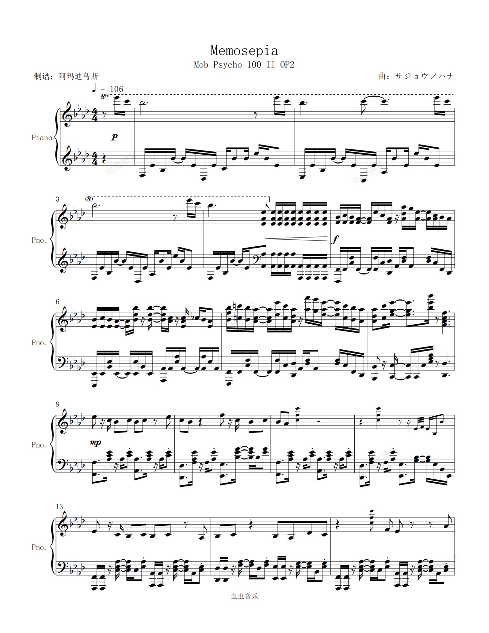 钢琴谱:灵能百分百 ED < Memosepia > メモセピア 原调高还原完整版本