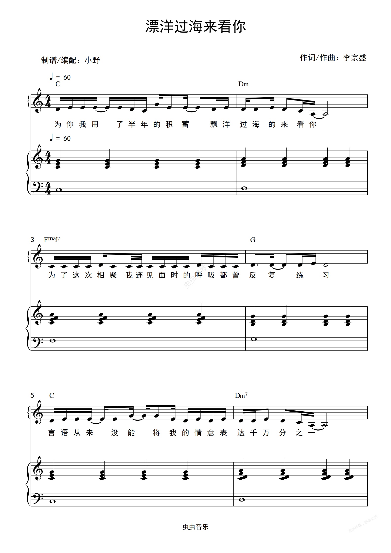 钢琴谱:漂洋过海来看你(和弦弹唱版)