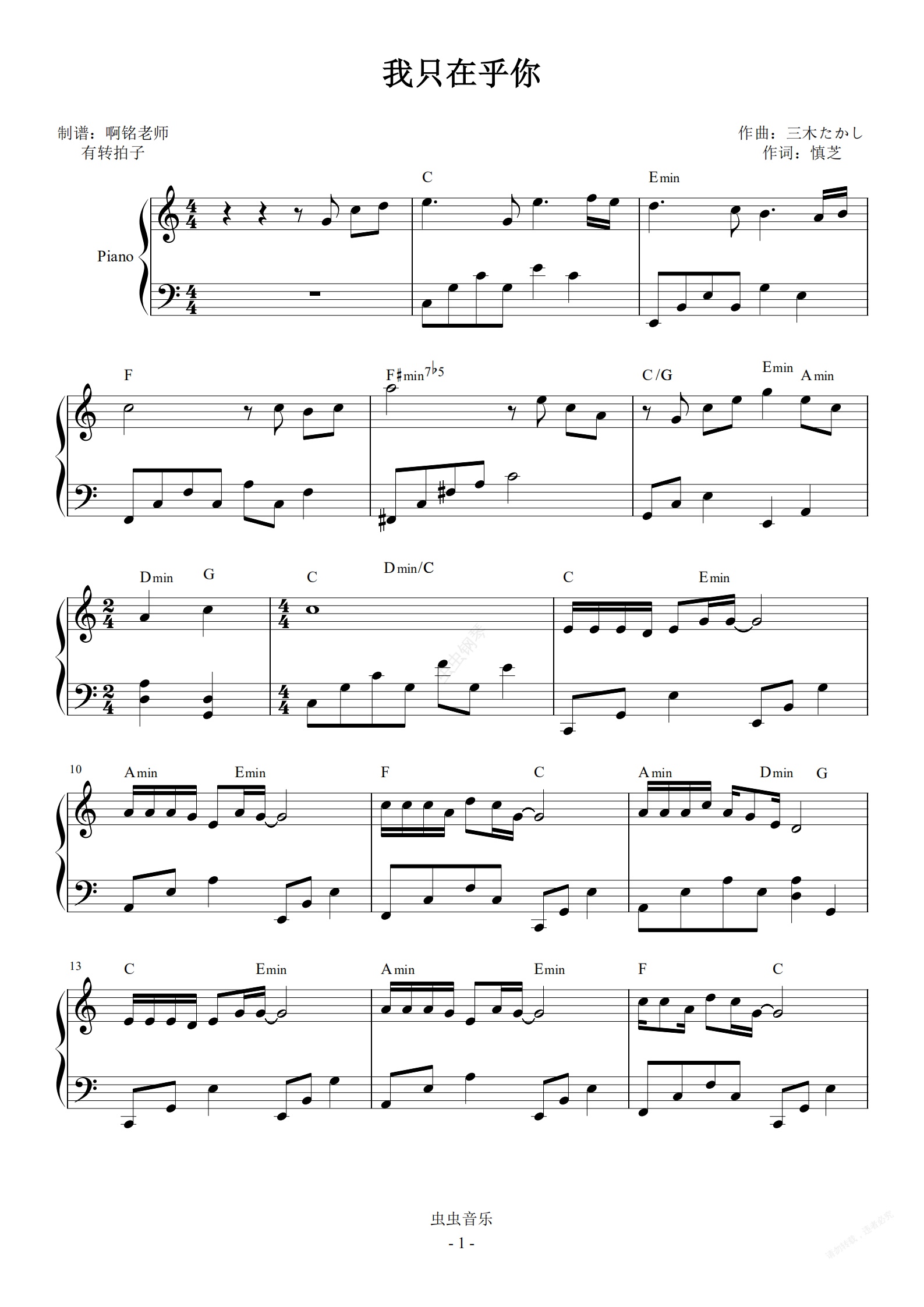 钢琴谱:我只在乎你 C调简易 怀旧经典