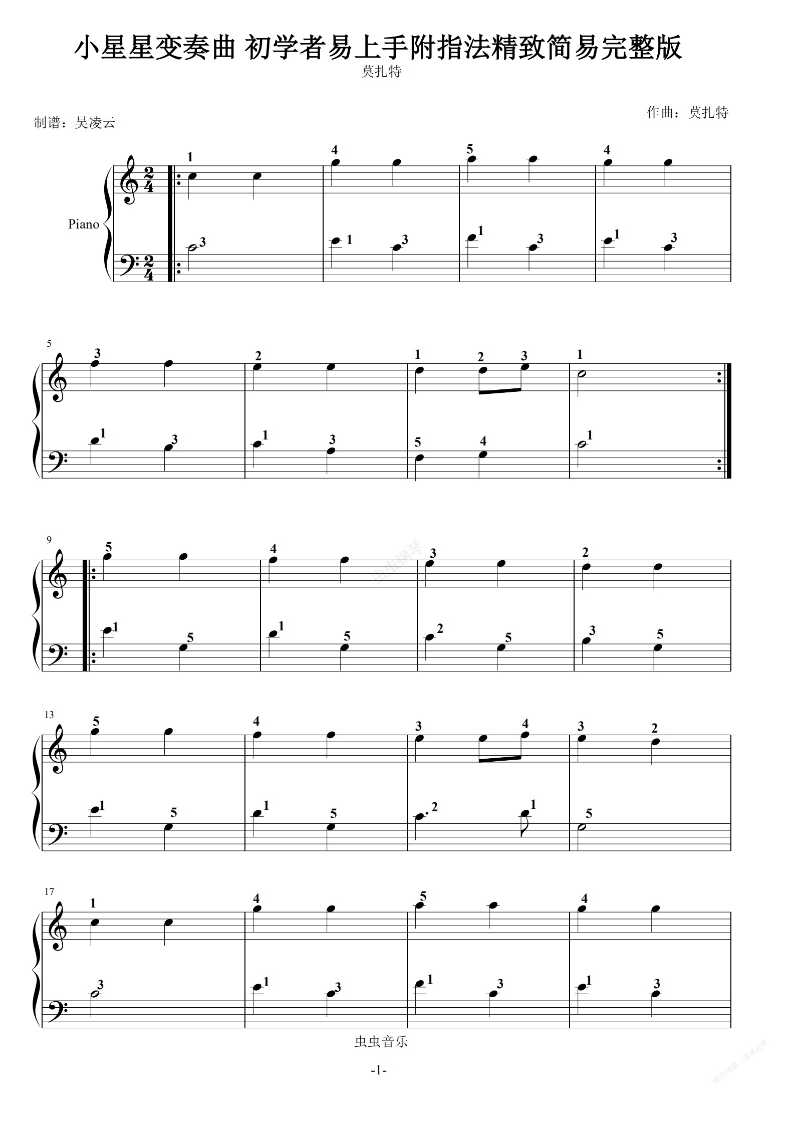 钢琴谱:小星星变奏曲 初学者易上手附指法精致简易完整版 吴凌云制作