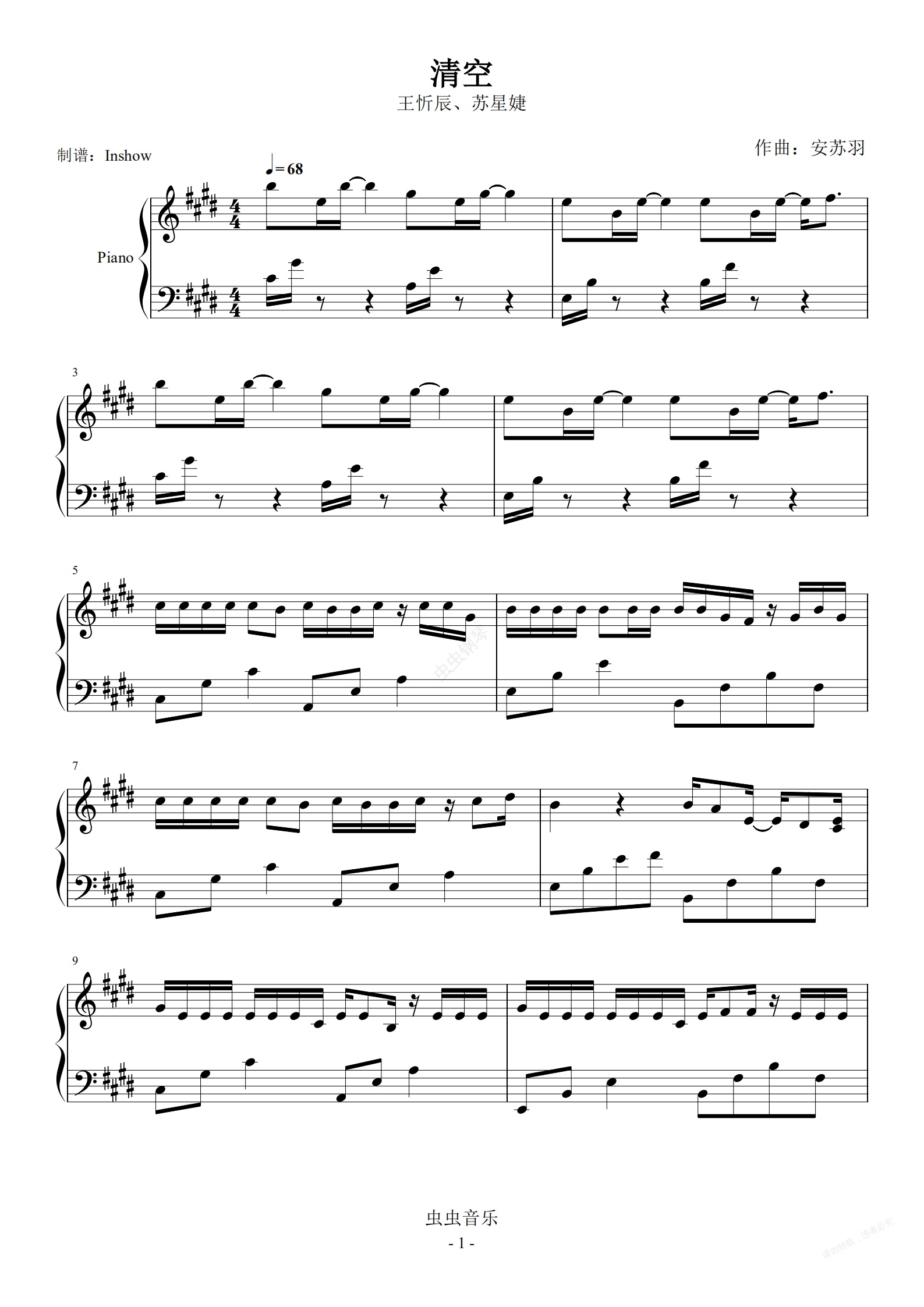 钢琴谱:清空【独奏】- 王忻辰/苏星婕 -