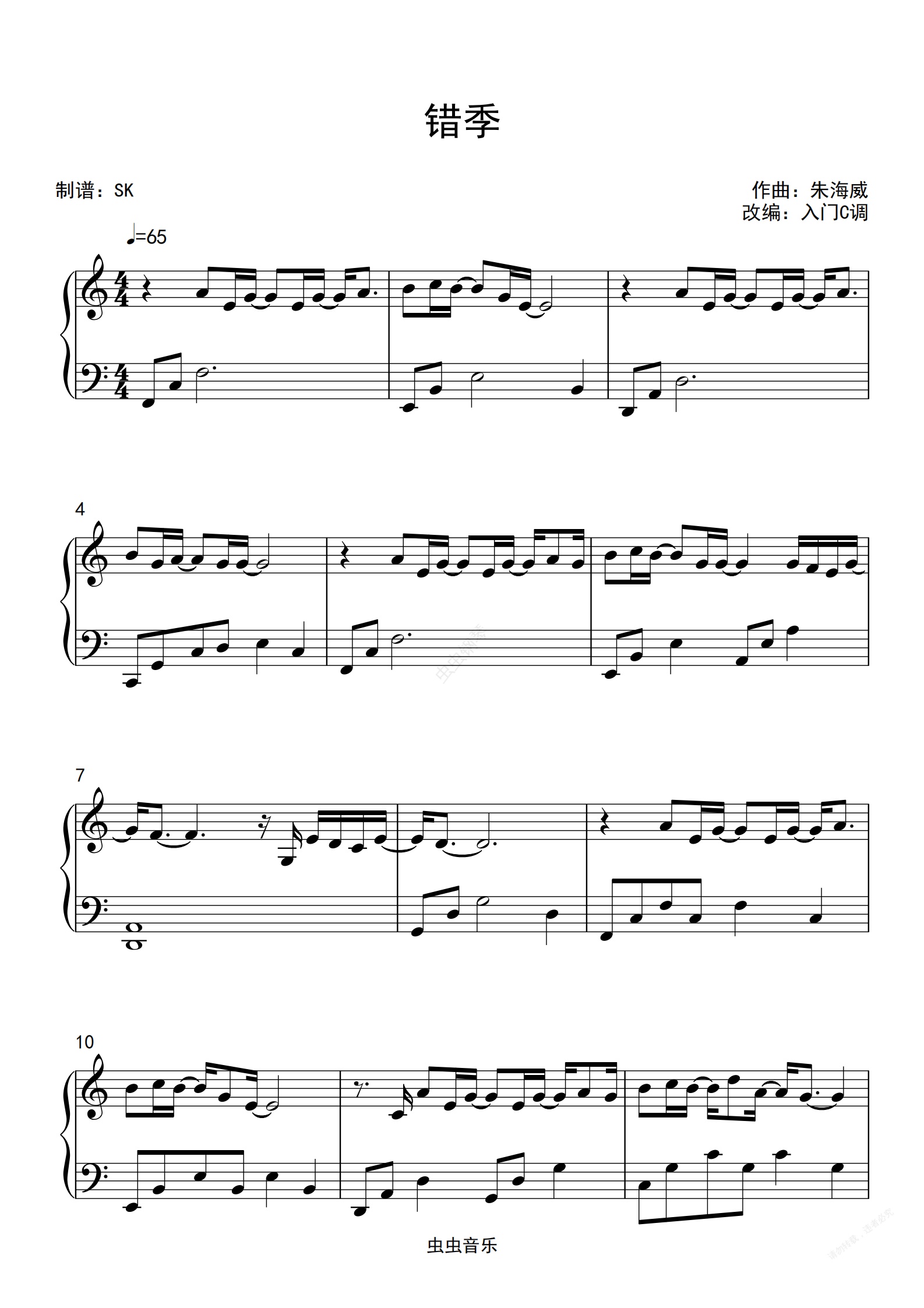 钢琴谱:秋塬依《错季》C调简单版