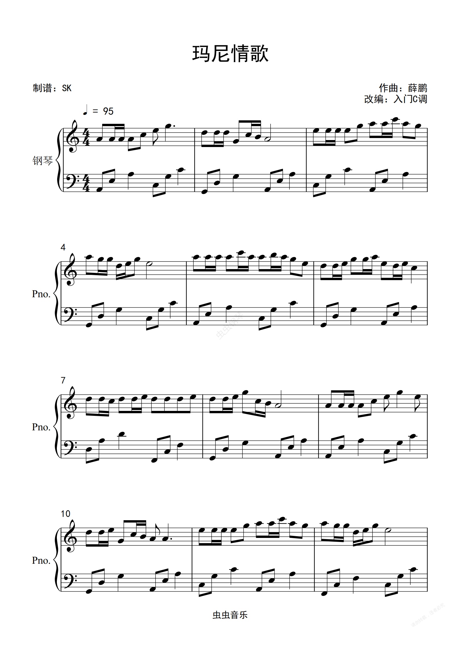 钢琴谱:上官红燕《玛尼情歌》C调简单版