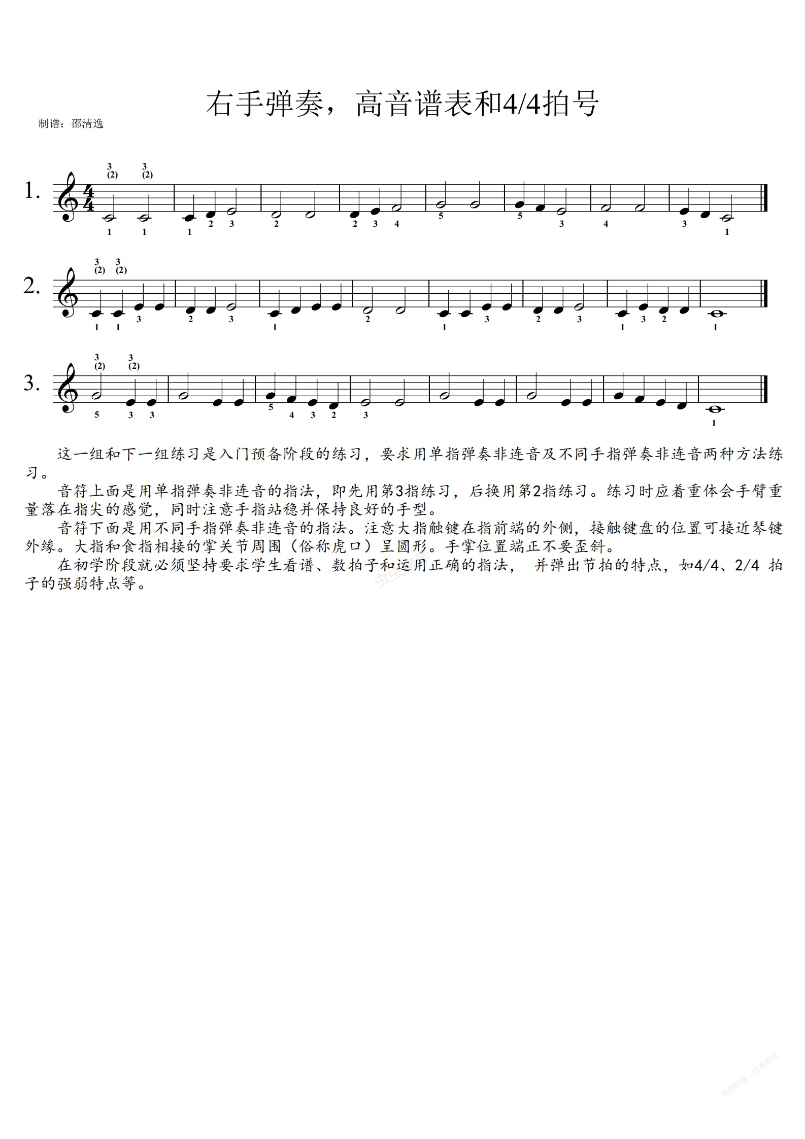 钢琴谱:钢琴基础教程1:右手弹奏,高音谱表和4/4拍号