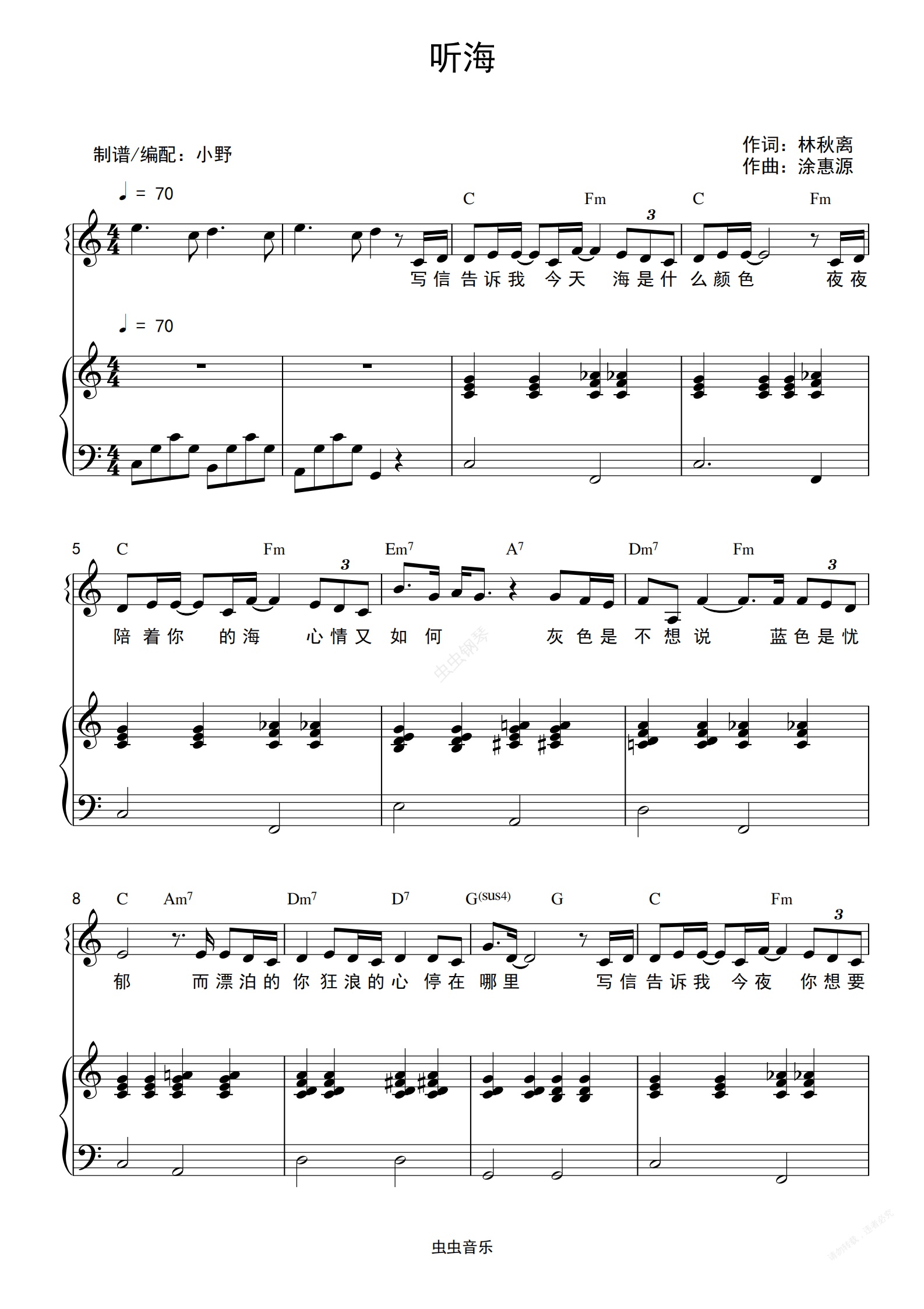 钢琴谱:听海(和弦弹唱版)