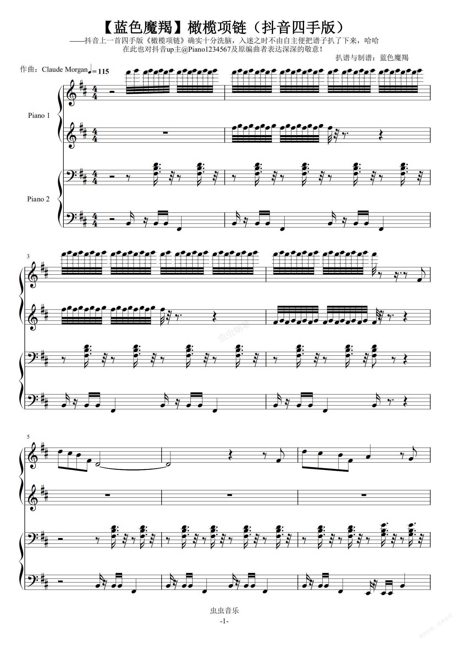 钢琴谱:【蓝色魔羯】抖音《橄榄项链》钢琴四手版