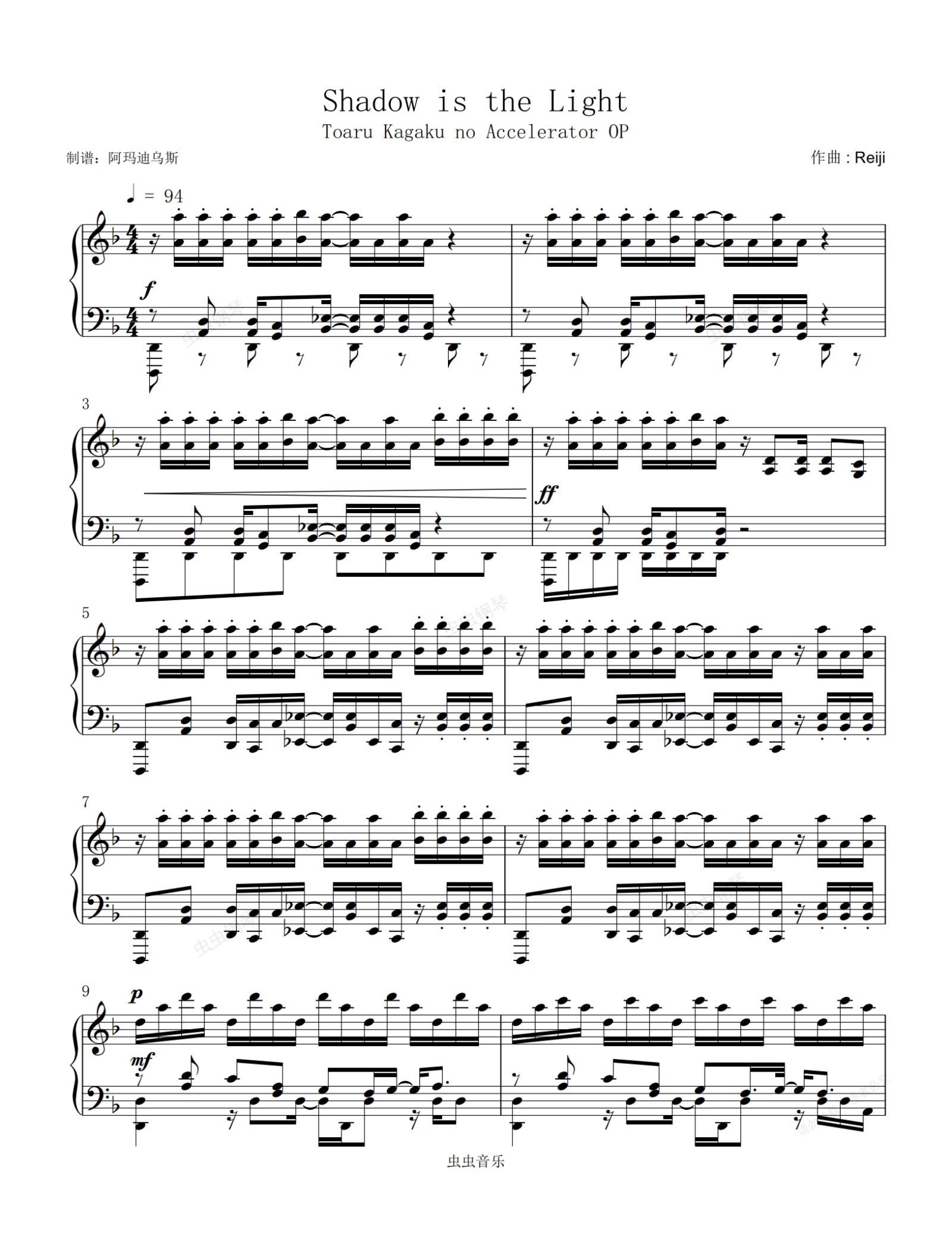 钢琴谱:某科学的一方通行 OP < Shadow is the Light > 原调高还原完整版本