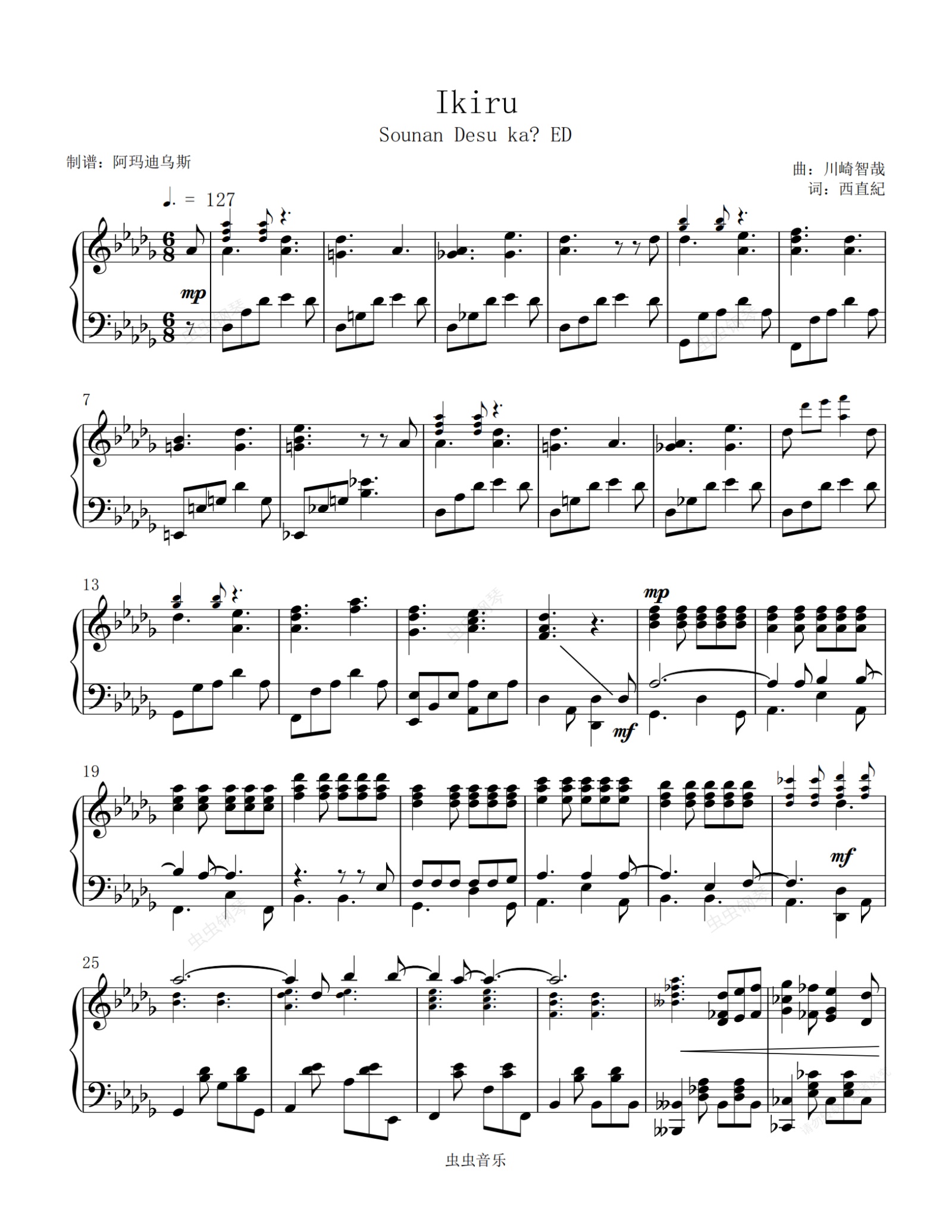 钢琴谱:你遭难了吗 ED < 生きる > 活着 原调高还原完整版本