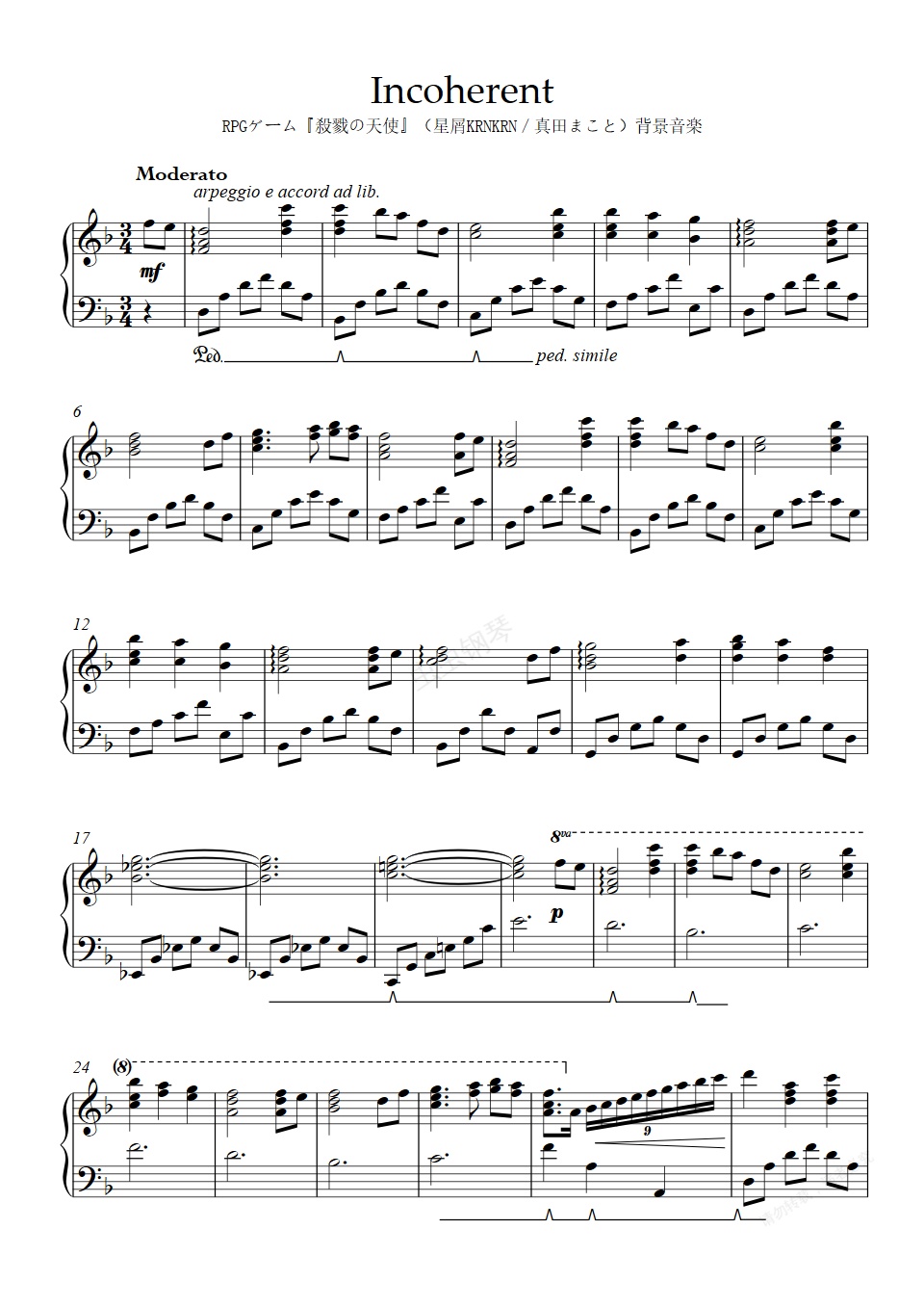 这是上次《星の破線》相关游戏的作者的后作,《杀戮的天使》(官方译名:X的天使)。这部游戏被改成了番,应该热度比较大吧。这首游戏里的插曲挺好听,扒到一半发现有人扒过,不甘心放弃还是完成了。tip:全曲的和弦可以自行添加和弦内音,并且可以自由弹奏琶音,乐谱上以及试听音频中的仅供参考。最后的反复反复三遍,第二遍时从倒数第四小节渐弱,第三遍从开始反复记号就开始渐弱,减弱到寂静。