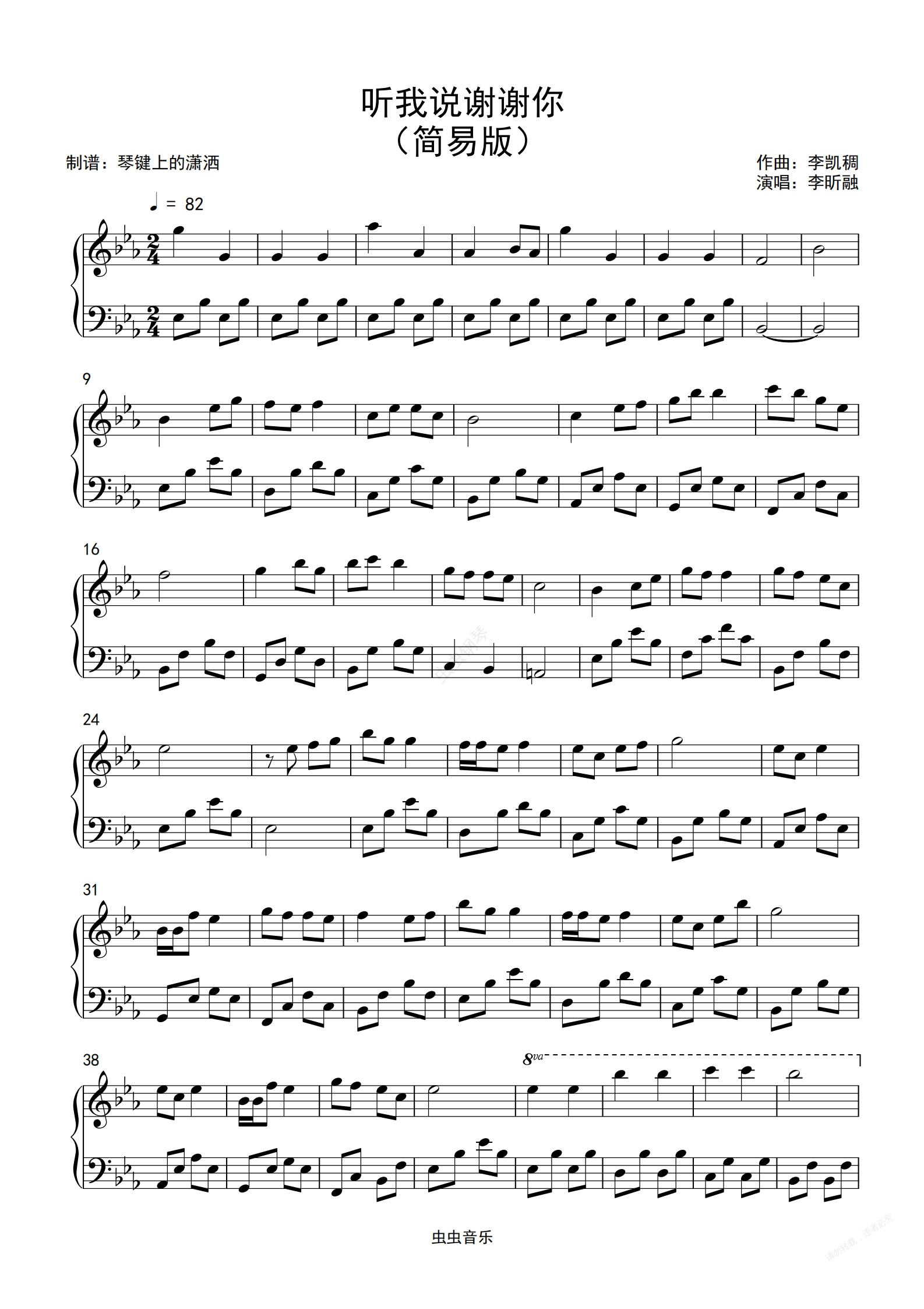钢琴谱:《听我说谢谢你》简易版-降E调独奏