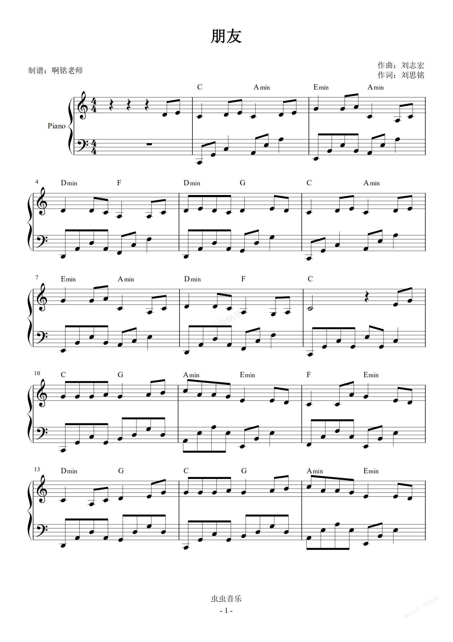 钢琴谱:朋友 C调简易 怀旧经典