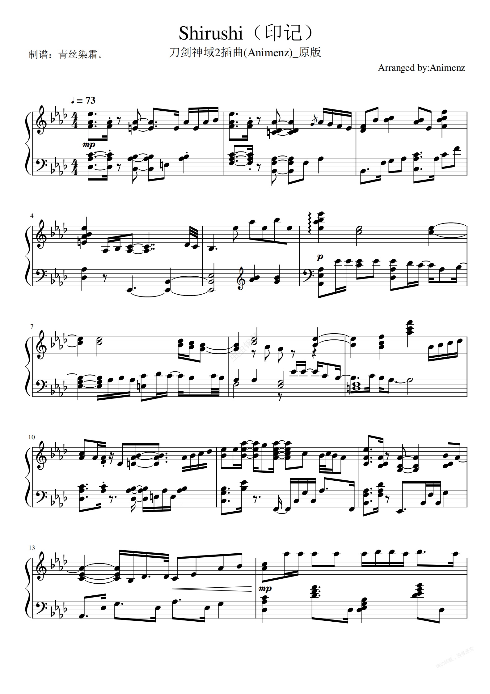 钢琴谱:Shirushi(印记)【刀剑神域2ED3】Animenz