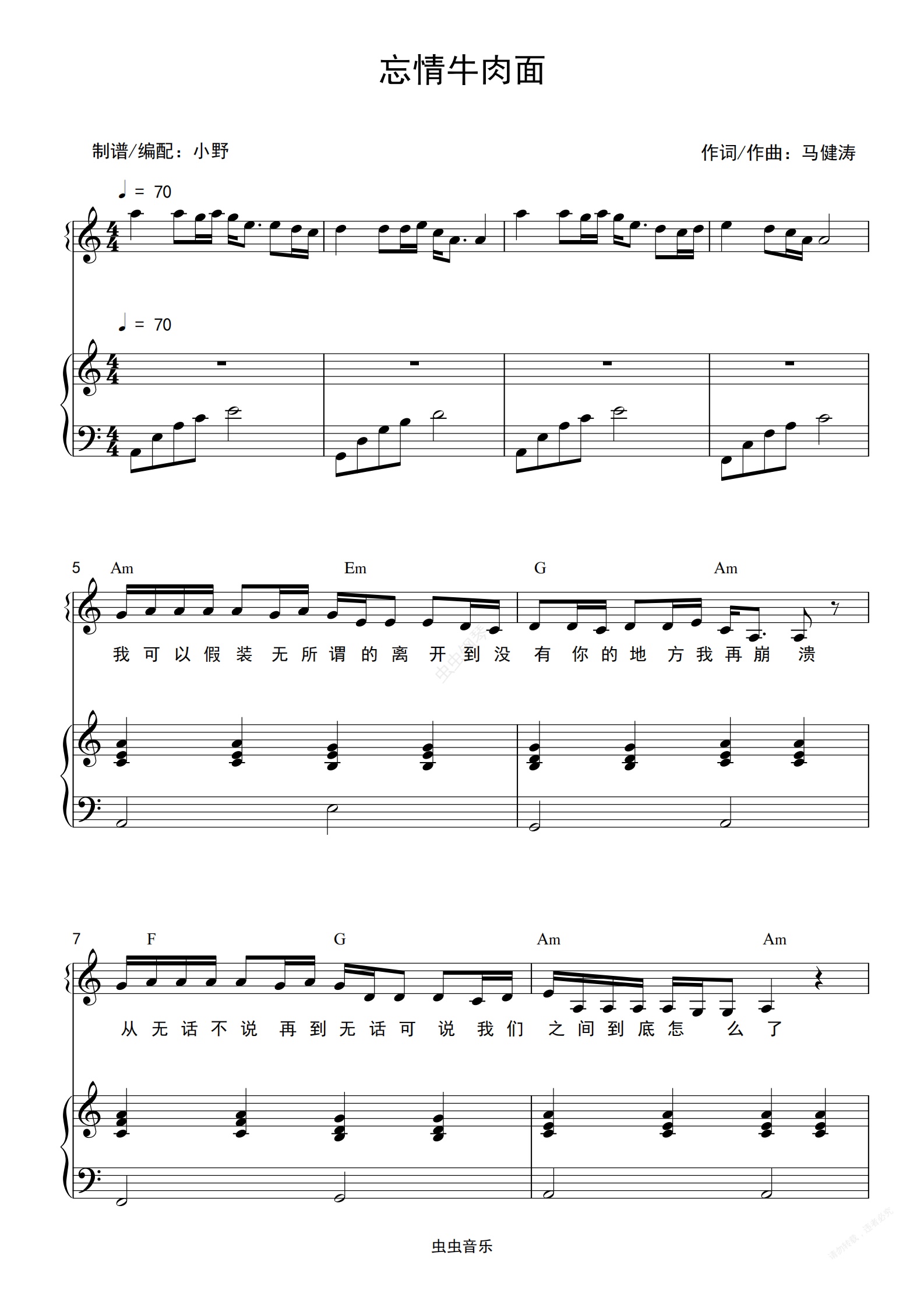钢琴谱:忘情牛肉面(和弦弹唱版)