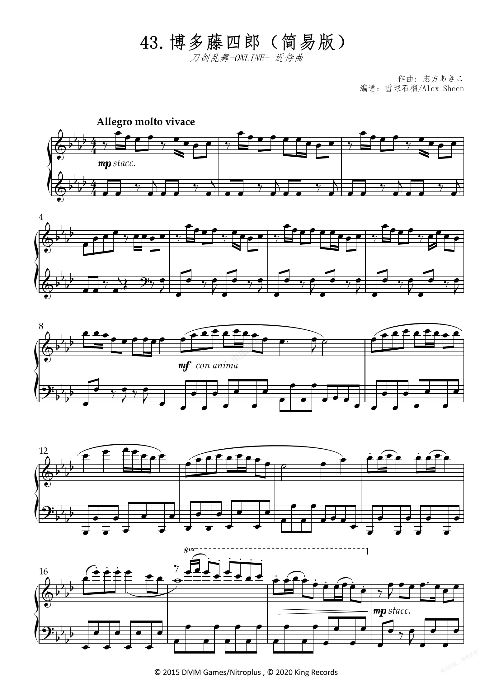 钢琴谱:博多藤四郎 近侍曲 【刀剑乱舞】(简易版)