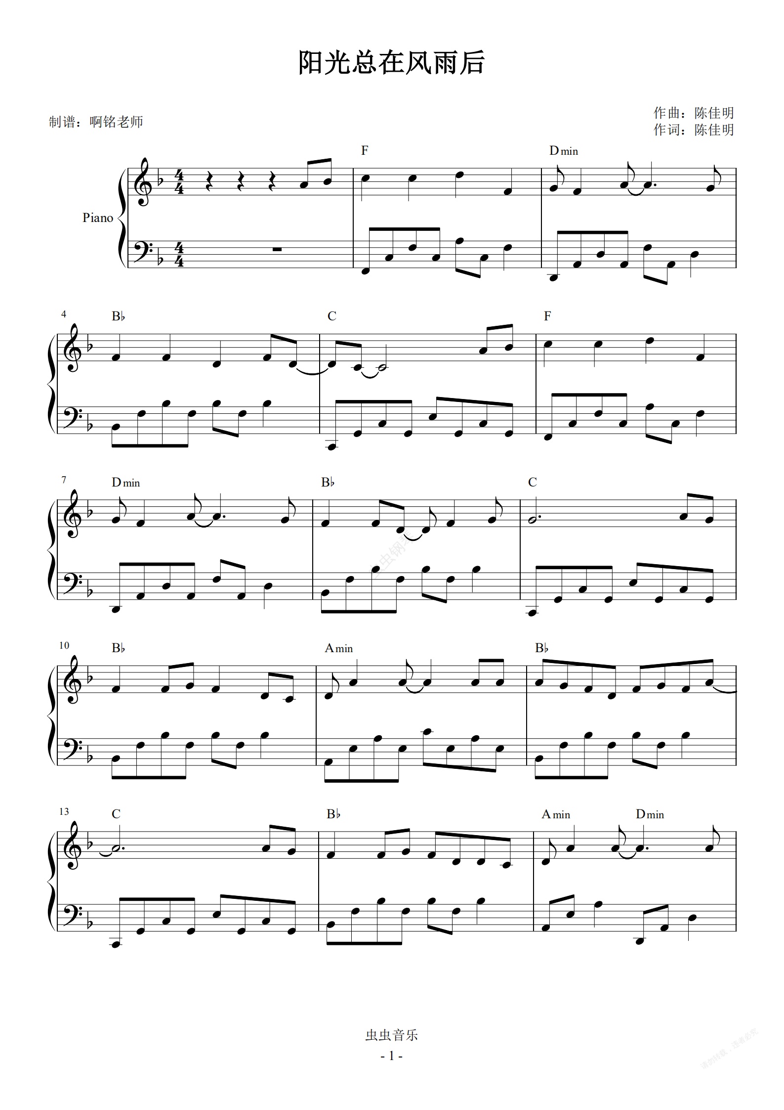 钢琴谱:阳光总在风雨后 F调简易 怀旧经典