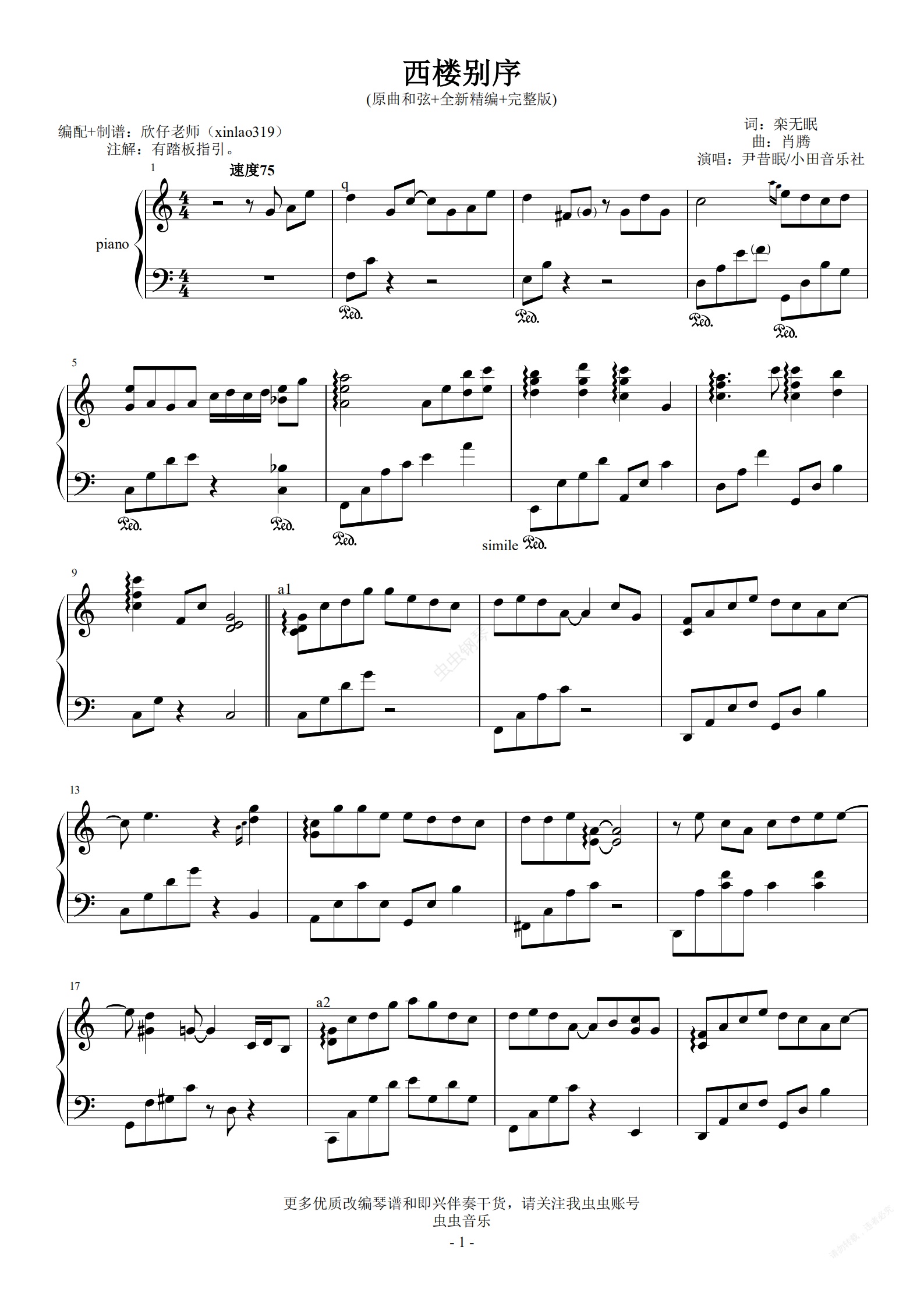 钢琴谱:C调-《西楼别序》(原曲和弦+全新精编+完整版)