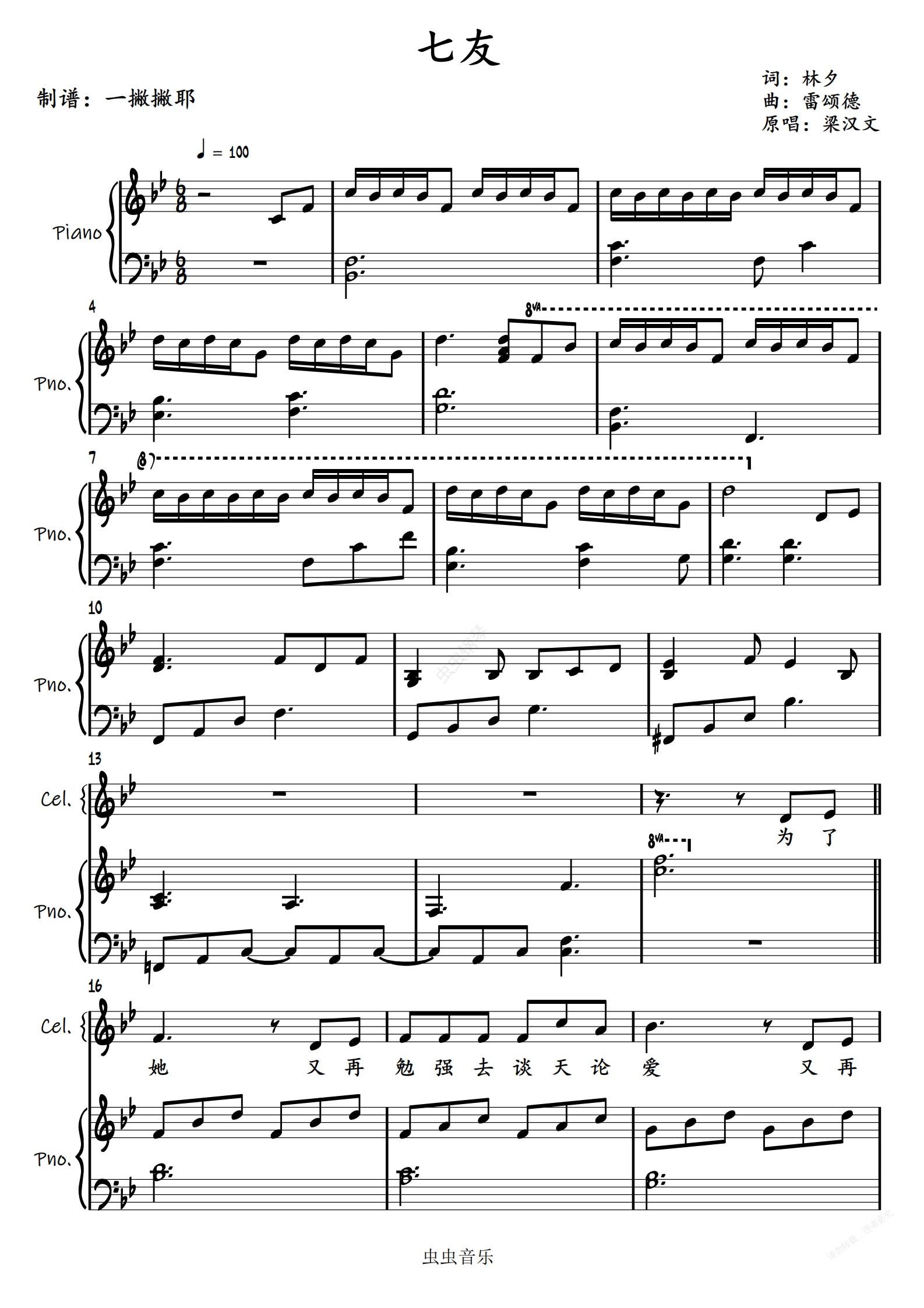 钢琴谱:七友【弹唱谱】梁汉文「一撇撇耶」