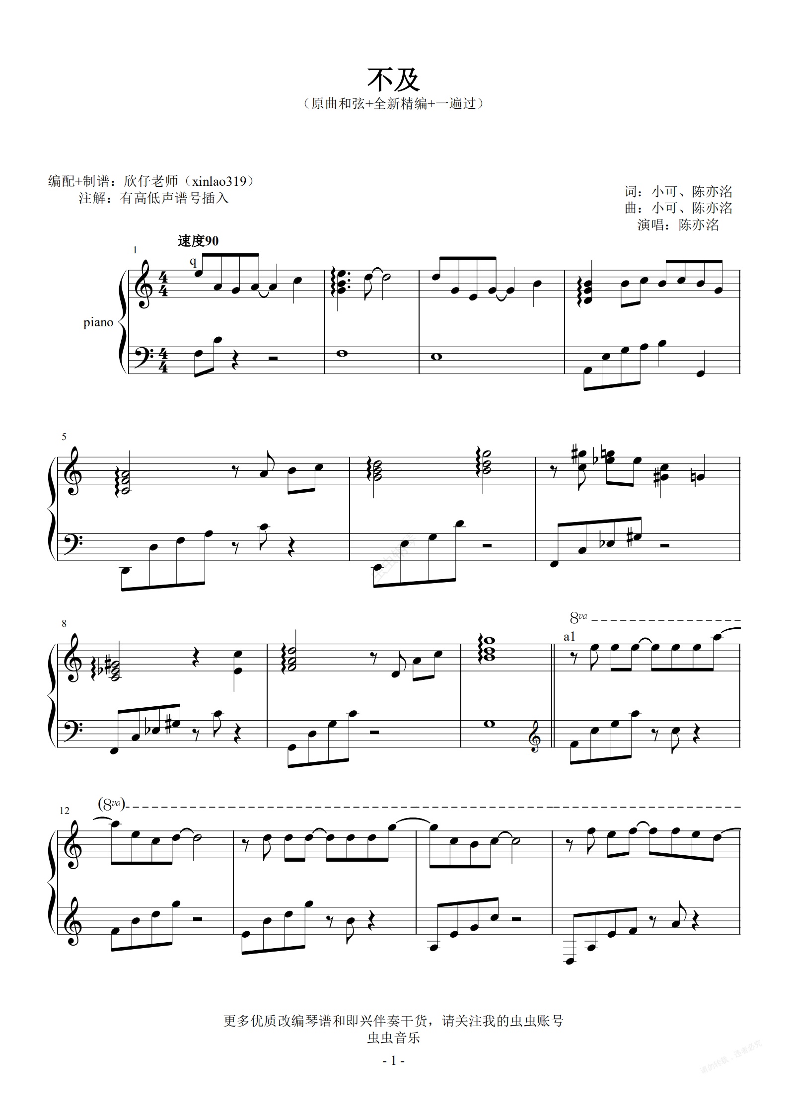 钢琴谱:陈亦洺-C调《不及》(原曲和弦+全新精编+一遍过)