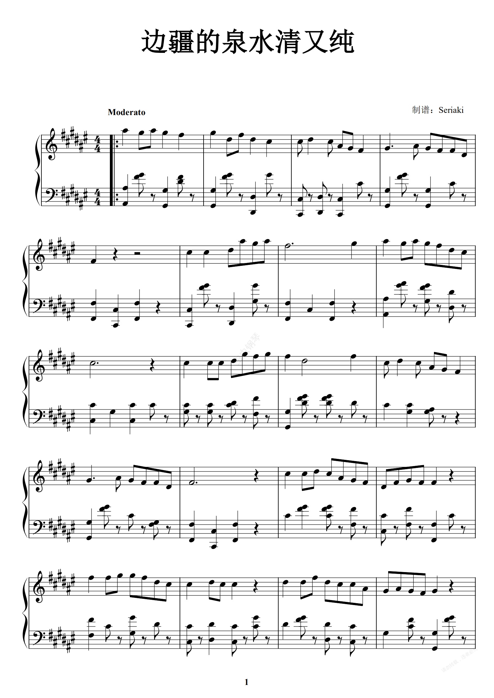 钢琴谱:边疆的泉水清又纯——#F宫调版