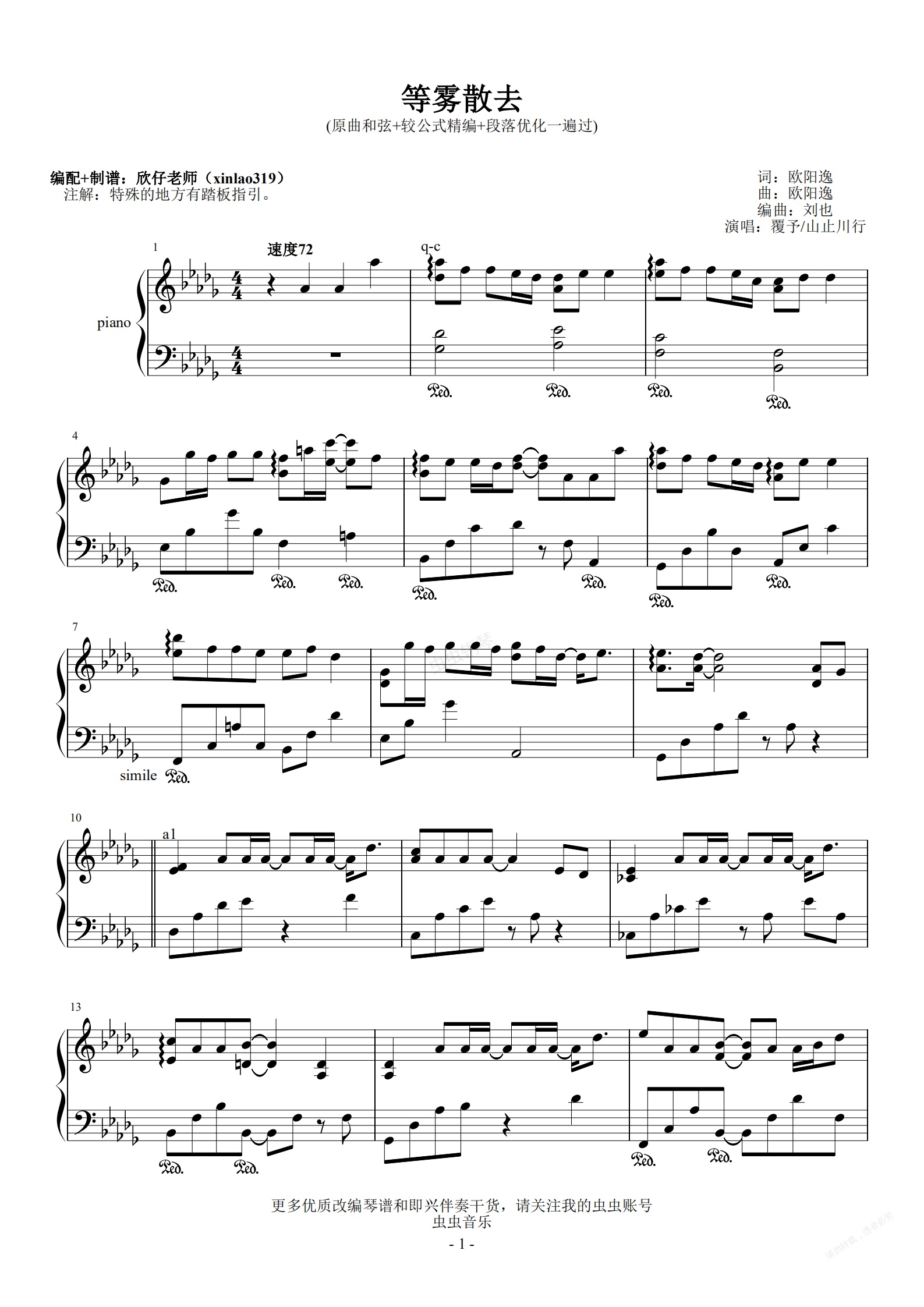 钢琴谱:升C-覆予/山止川行《等雾散去》(原曲和弦+较公式简化+一遍过)