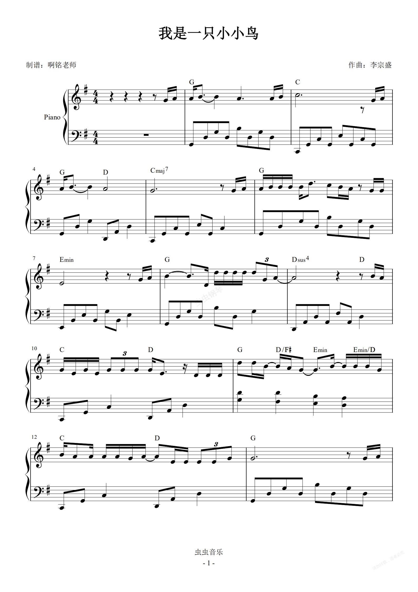钢琴谱:我是一只小小鸟 G调简易 原版和弦