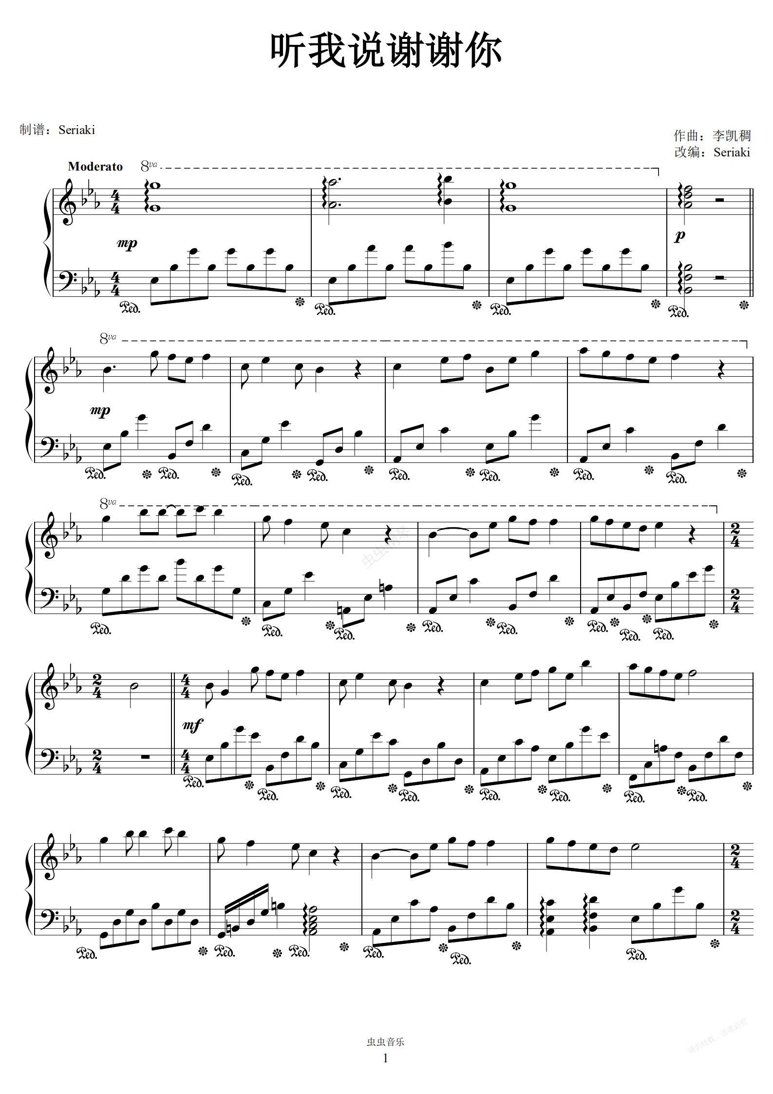 钢琴谱:听我说谢谢你——唯美独奏改编版